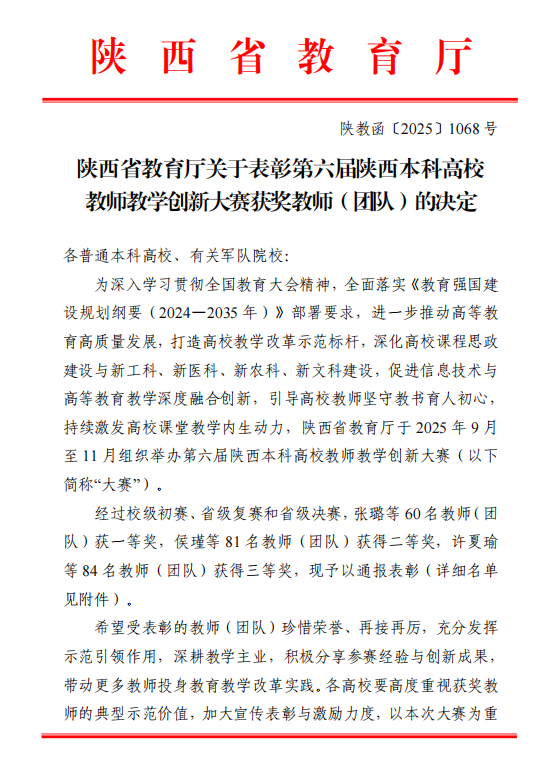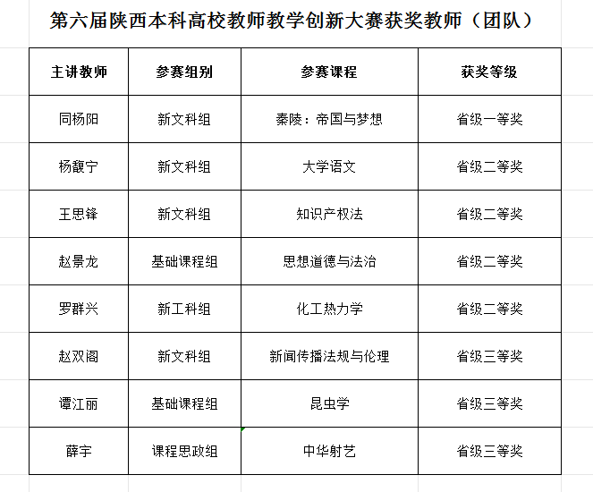 近日,陕西省教育厅公布了第六届陕西本科高校教师教学创新大赛获奖名单,乐投(中国)一站式服务平台文化遗产学院同杨阳教师团队获省级一等奖,文学院杨馥宁教师团队、法学院王思锋教师团队、马克思主义学院赵景龙教师团队和化工学院罗群兴教师团队获省级二等奖,新闻传播学院赵双阁教师团队、生命科学学院谭江丽教师团队和体育教研部薛宇教师团队获省级三等奖。