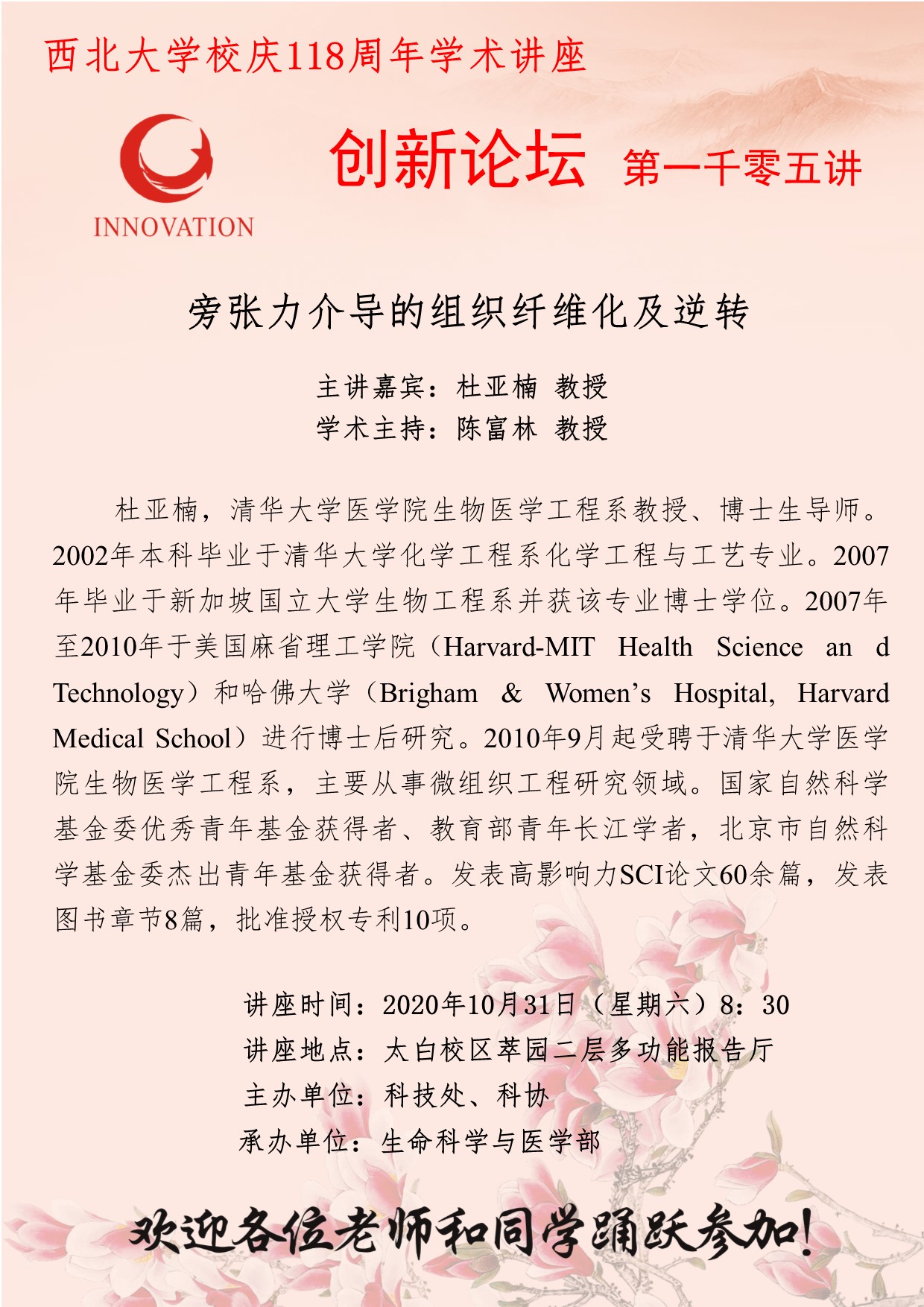 杜亚楠 教授 乐投平台创新论坛第一千零五讲暨校庆118周年学术讲座:旁张力介导的组织纤维化及逆转 讲座时间 2020年10月31日(星期六)8:30 讲座地点 太白校区萃园二层多功能报告厅 讲座人介绍 杜亚楠 教授 讲座内容