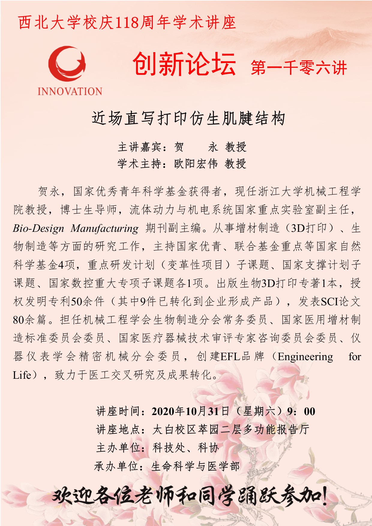 贺永 教授 乐投平台创新论坛第一千零六讲暨校庆118周年学术讲座:近场直写打印仿生肌腱结构 讲座时间 2020年10月31日(星期六)9:00 讲座地点 太白校区萃园二层多功能报告厅 讲座人介绍 贺永 教授 讲座内容
