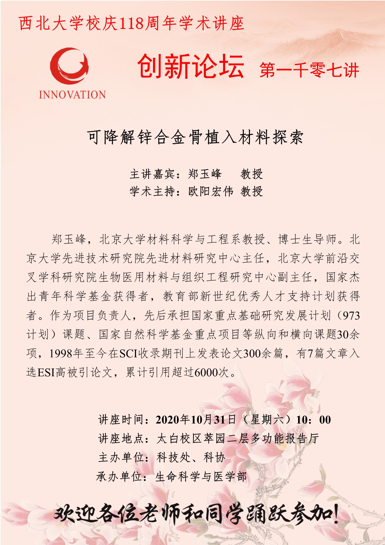 郑玉峰 教授 乐投平台创新论坛第一千零七讲暨校庆118周年学术讲座:可降解锌合金骨植入材料探索 讲座时间 2020年10月31日(星期六)10:00 讲座地点 太白校区萃园二层多功能报告厅 讲座人介绍 郑玉峰 教授 讲座内容