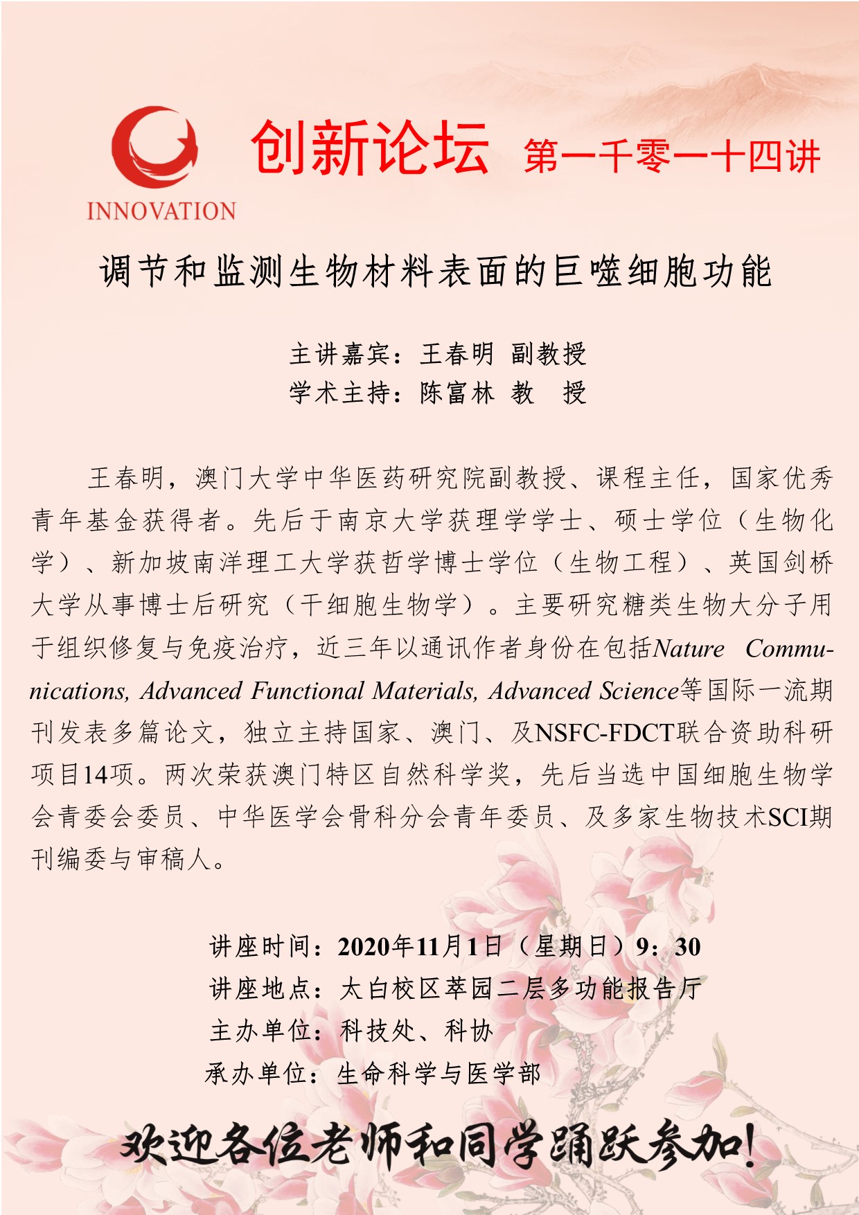 王春明 副教授 乐投平台创新论坛第一千零一十四讲:调节和监测生物材料表面的巨噬细胞功能 讲座时间 2020年11月1日(星期日)9:30 讲座地点 太白校区萃园二层多功能报告厅 讲座人介绍 王春明 副教授 讲座内容