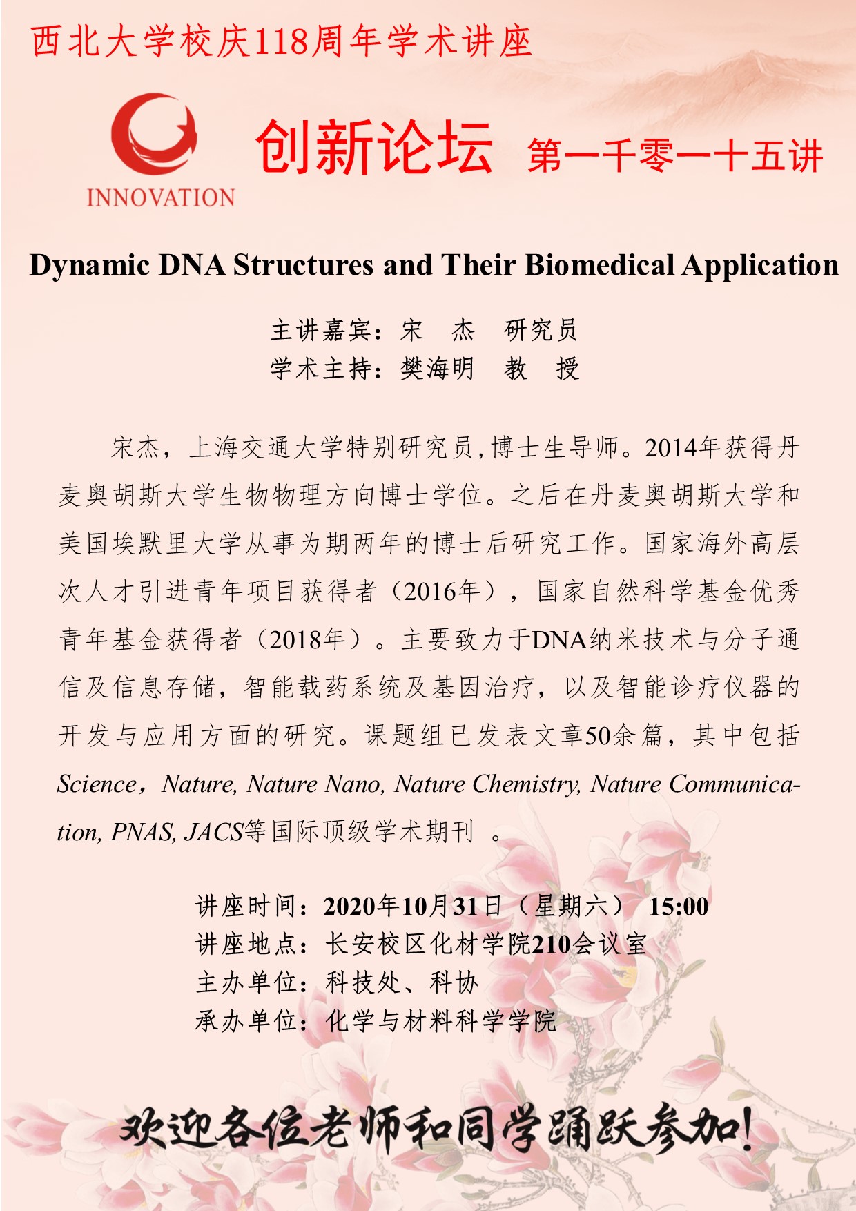 宋杰 研究员 乐投平台创新论坛第一千零一十五讲暨校庆118周年学术讲座:Dynamic DNA Structures and Their Biomedical Application 讲座时间 2020年10月31日(星期六)15:00 讲座地点 化学与材料科学学院210室 讲座人介绍 宋杰 研究员 讲座内容
