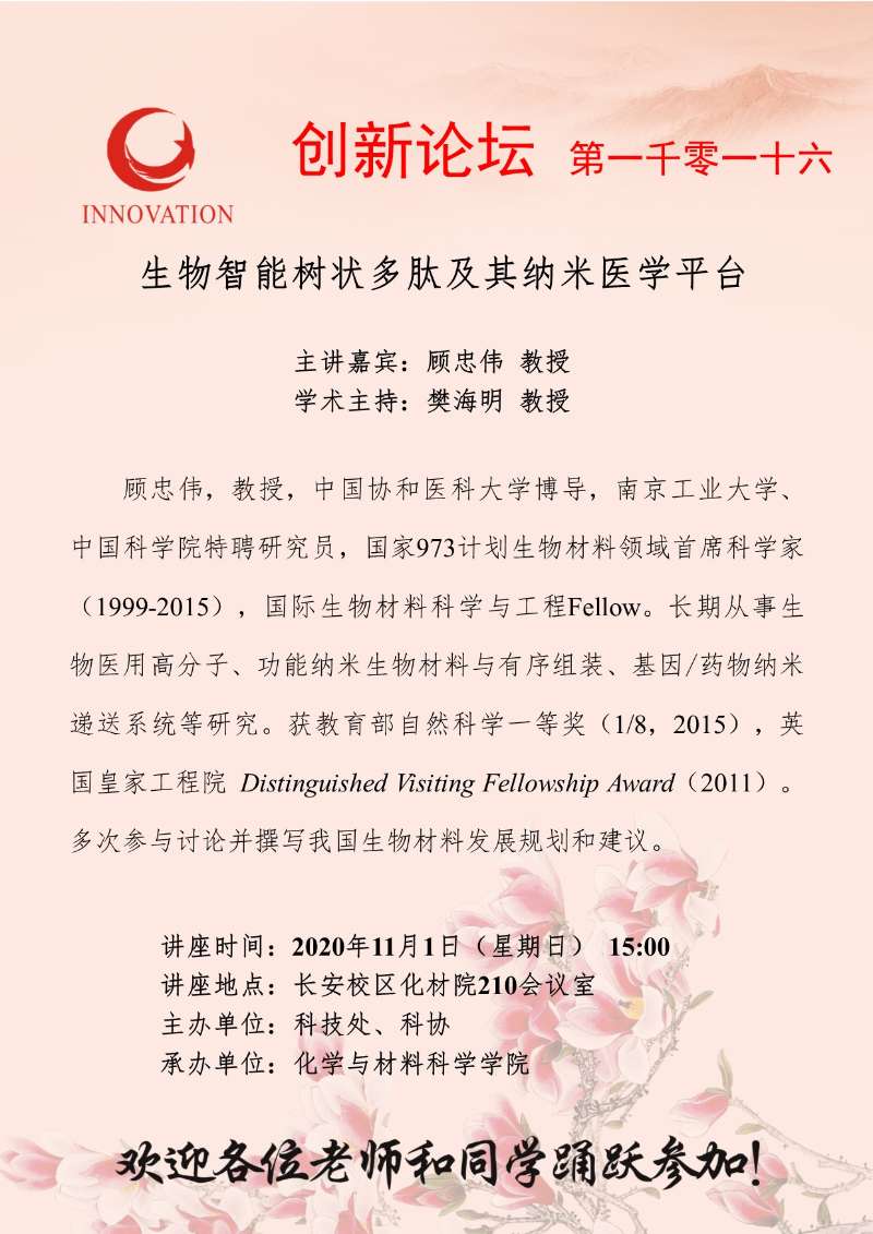 顾忠伟 教授 乐投平台创新论坛第一千零一十六讲:生物智能树状多肽及其纳米医学平台 讲座时间 2020年11月1日(星期日) 15:00 讲座地点 长安校区化材院210会议室 讲座人介绍 顾忠伟 教授 讲座内容