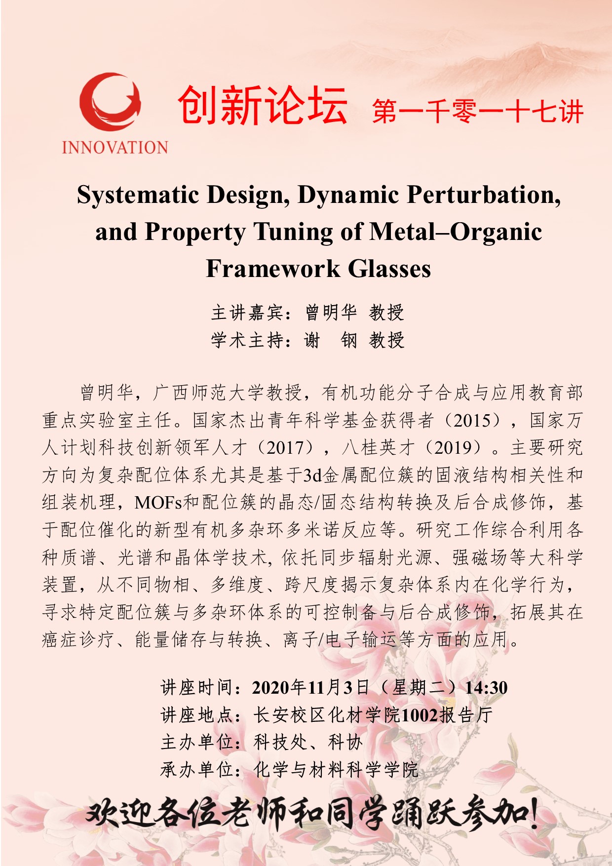 曾明华 教授 乐投平台创新论坛第一千零一十七讲:Systematic Design, Dynamic Perturbation, and Property Tuning of Metal–Organic Framework Glasses 讲座时间 2020年11月3日(星期二)14:30 讲座地点 长安校区化材学院1002报告厅 讲座人介绍 曾明华 教授 讲座内容