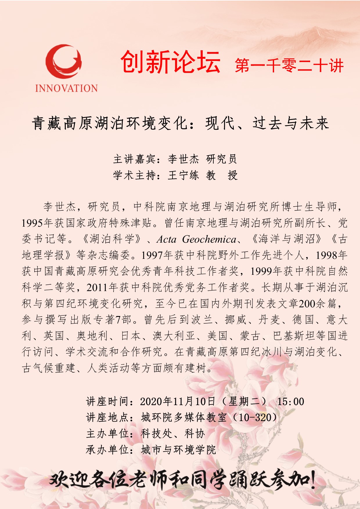 李世杰 研究员 乐投平台创新论坛第一千零二十讲:青藏高原湖泊环境变化:现代、过去与未来 讲座时间 2020年11月10日(星期二) 15:00 讲座地点 城环院多媒体教室(10-320) 讲座人介绍 李世杰 研究员 讲座内容