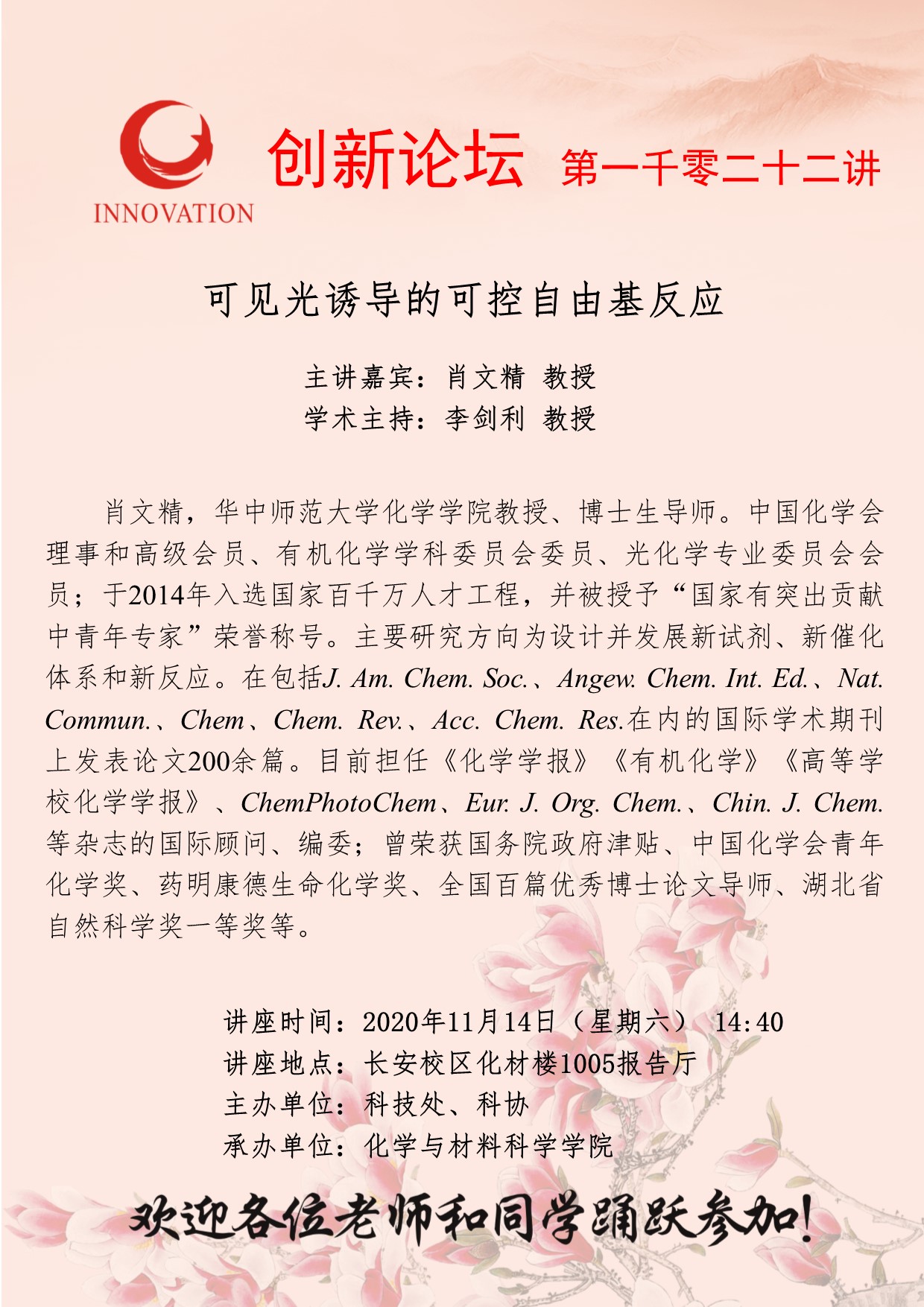 肖文精 教授 乐投平台创新论坛第一千零二十二讲:可见光诱导的可控自由基反应 讲座时间 2020年11月14日(周六)14:40 讲座地点 长安校区化材楼1005报告厅 讲座人介绍 肖文精 教授 讲座内容