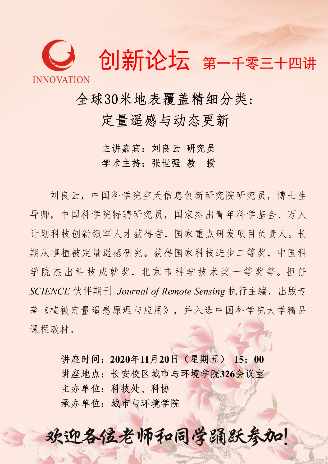 刘良云 研究员 乐投平台创新论坛第一千零三十四讲:全球30米地表覆盖精细分类:定量遥感与动态更新 讲座时间 2020年11月20日(星期五) 15:00 讲座地点 长安校区城市与环境学院326会议室 讲座人介绍 刘良云 研究员 讲座内容