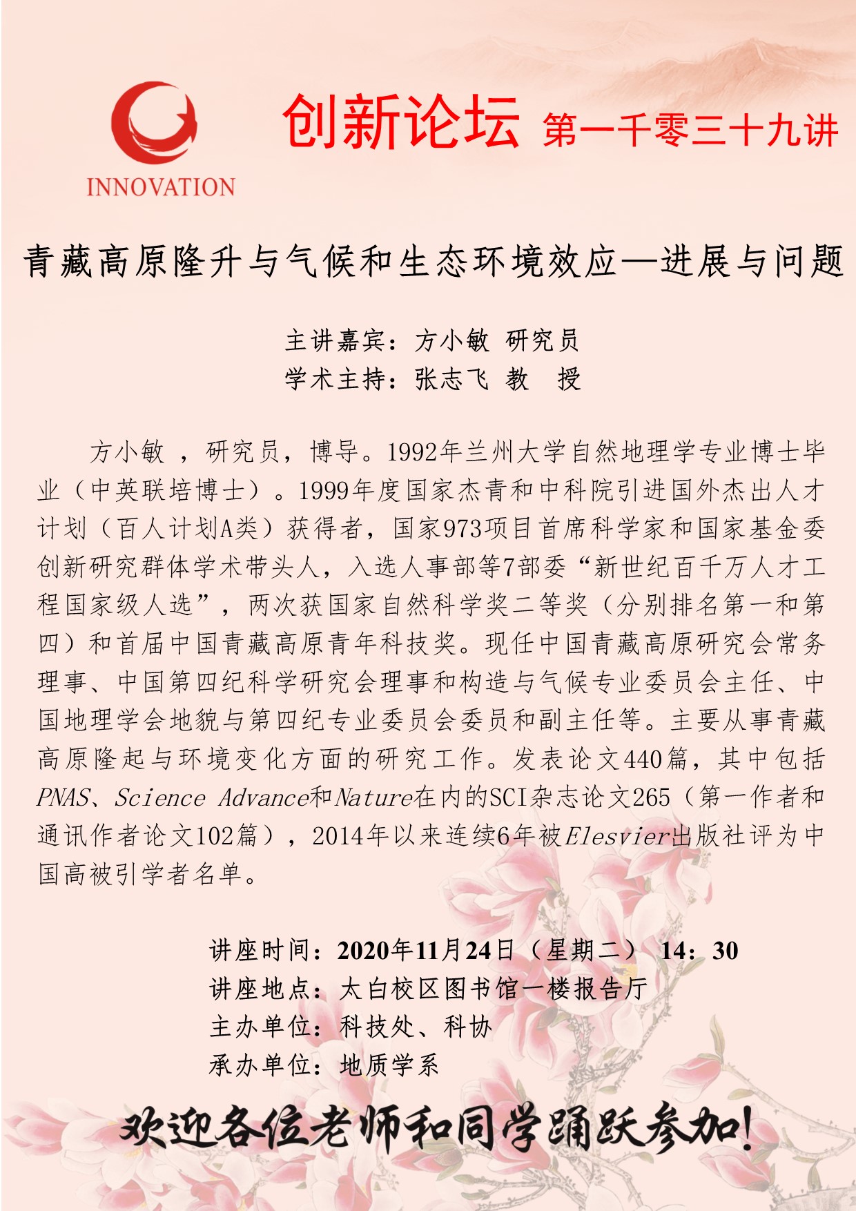 方小敏 研究员 乐投平台创新论坛第一千零三十九讲:青藏高原隆升与气候和生态环境效应—进展与问题 讲座时间 2020年11月24日(星期二)14:30 讲座地点 太白校区图书馆一楼报告厅 讲座人介绍 方小敏 研究员 讲座内容