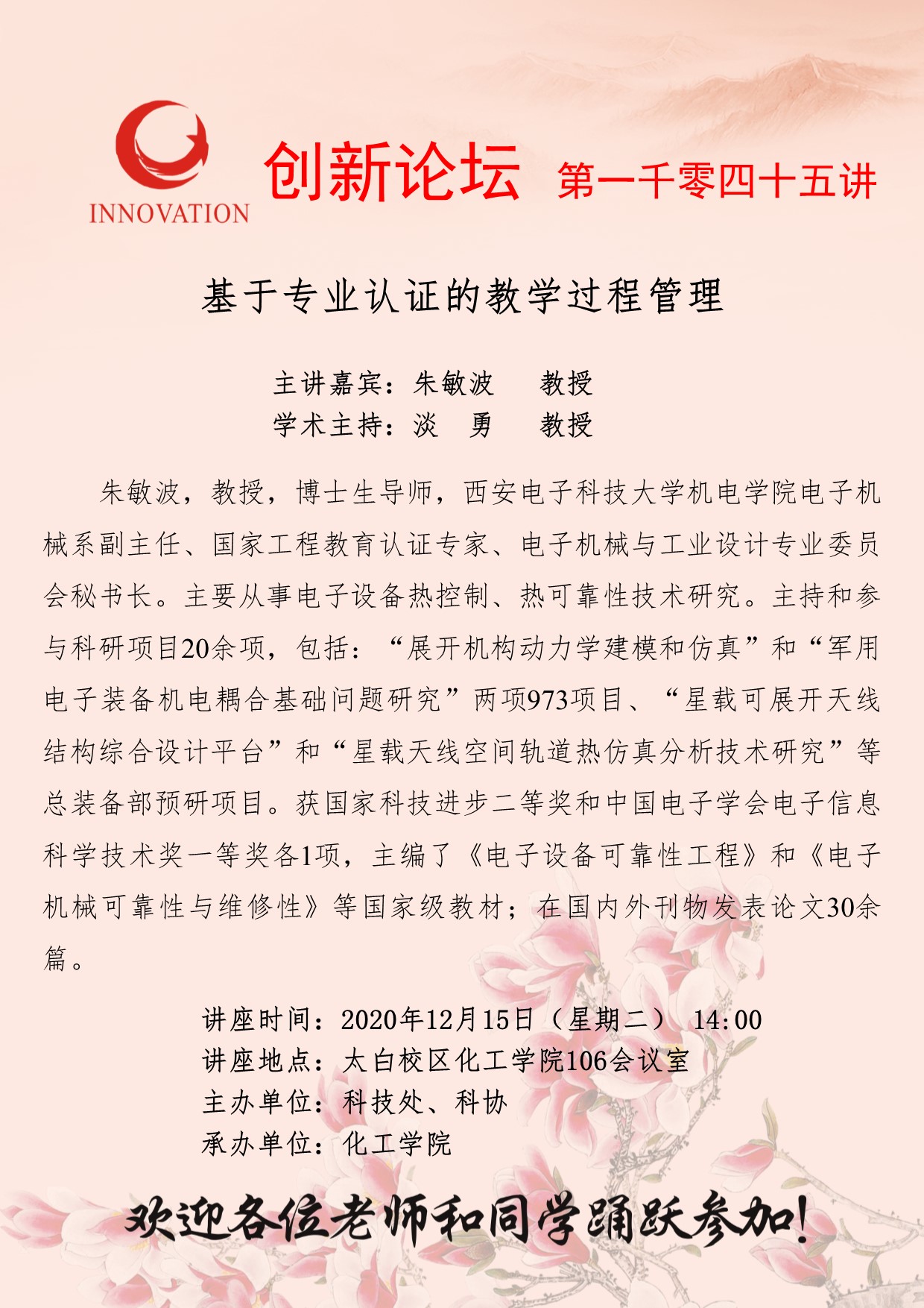 朱敏波 教授 乐投平台创新论坛第一千零四十五讲:基于专业认证的教学过程管理 讲座时间 2020年12月15日(星期二) 14:00 讲座地点 太白校区化工学院106会议室 讲座人介绍 朱敏波 教授 讲座内容