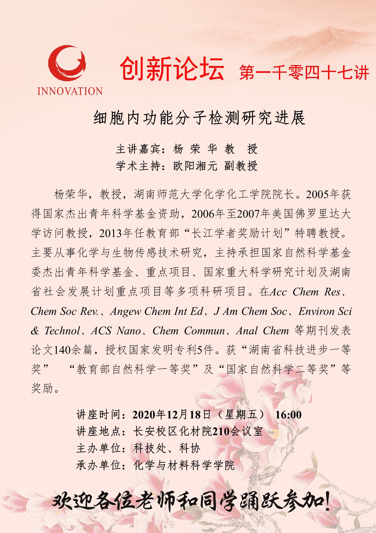 杨荣华 教授 乐投平台创新论坛第一千零四十七讲:细胞内功能分子检测研究进展 讲座时间 2020年12月18日(星期五) 16:00 讲座地点 长安校区化材院210会议室 讲座人介绍 杨荣华 教授 讲座内容