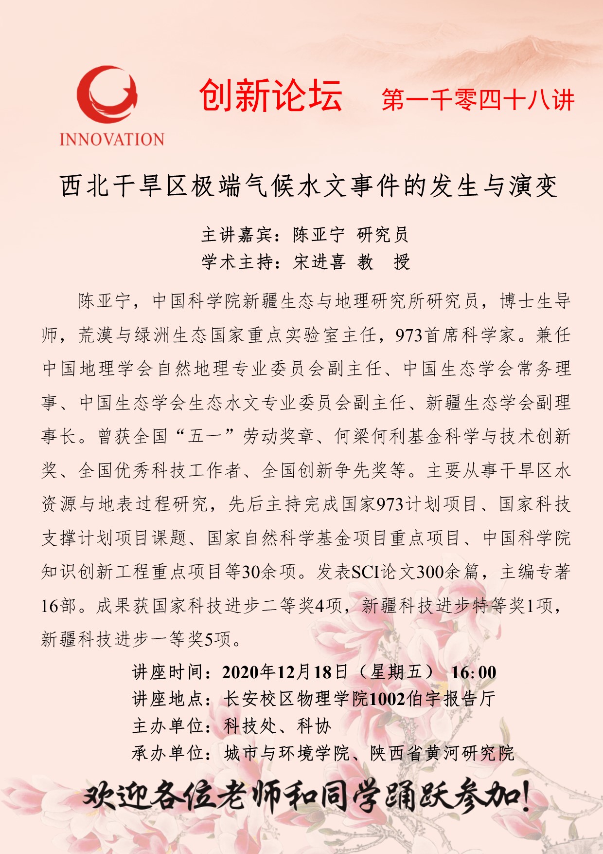 陈亚宁 研究员 乐投平台创新论坛第一千零四十八讲:西北干旱区极端气候水文事件的发生与演变研究 讲座时间 2020年12月18日(星期五)16:00 讲座地点 长安校区物理楼伯宇报告厅 讲座人介绍 陈亚宁 研究员 讲座内容