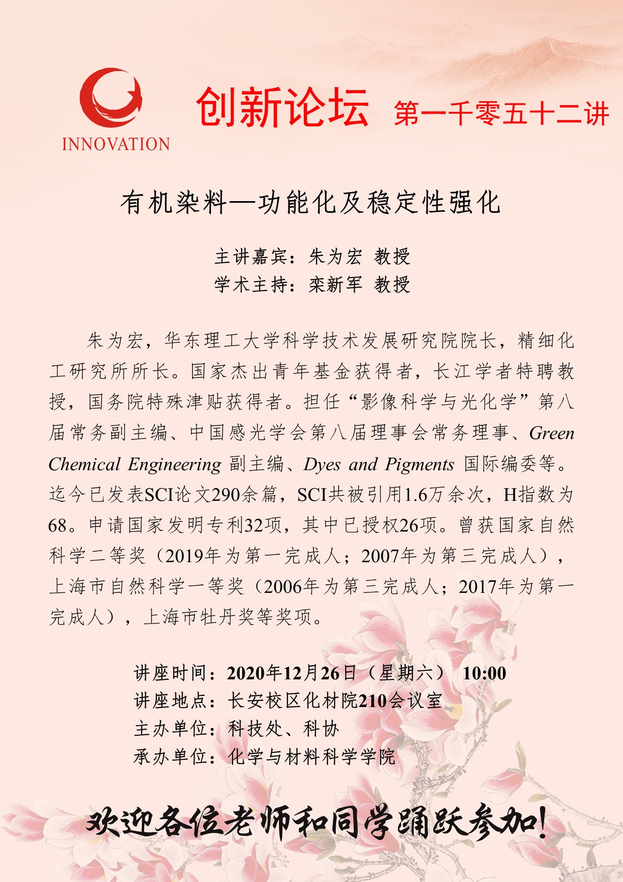朱为宏 教授 乐投平台创新论坛第一千零五十二讲: 有机染料—功能化及稳定性强化 讲座时间 2020年12月26日(星期六) 10:00 讲座地点 长安校区化材院210会议室 讲座人介绍 朱为宏 教授 讲座内容