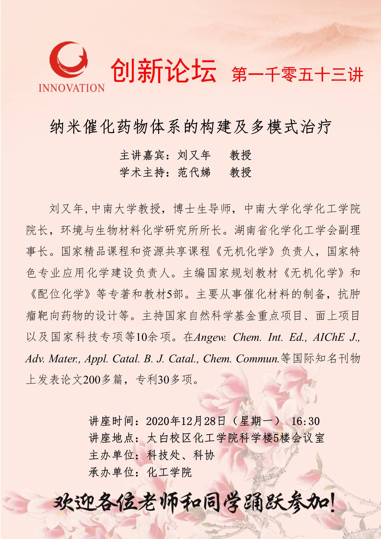 刘又年 教授 乐投平台创新论坛第一千零五十三讲:纳米催化药物体系的构建及多模式治疗 讲座时间 2020年12月28日(星期一) 16:30 讲座地点 太白校区化工学院科学楼5楼会议室 讲座人介绍 刘又年 教授 讲座内容