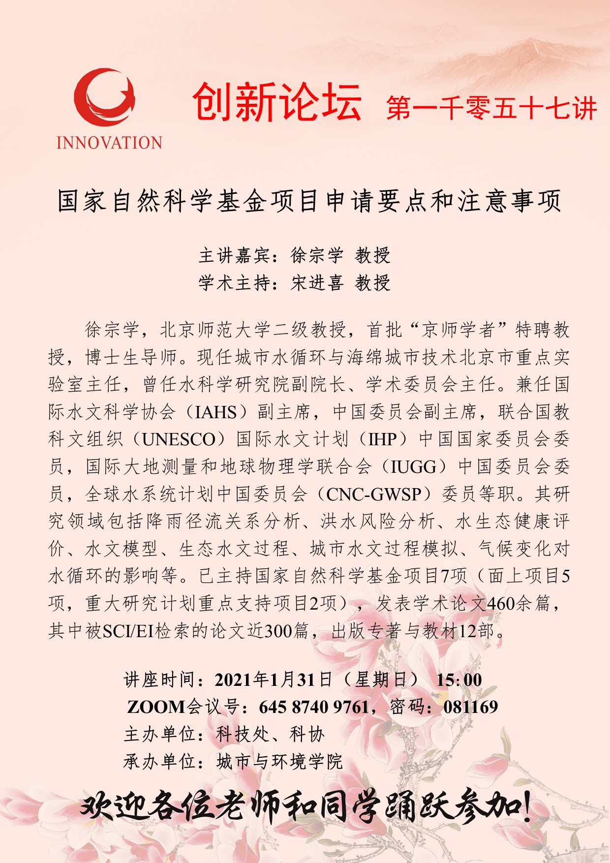 徐宗学 教授 乐投平台创新论坛第一千零五十七讲:国家自然科学基金项目申请要点和注意事项 讲座时间 2021年1月31日(星期日) 15:00 讲座地点 ZOOM会议号:64587409761,密码:081169 讲座人介绍 徐宗学 教授 讲座内容