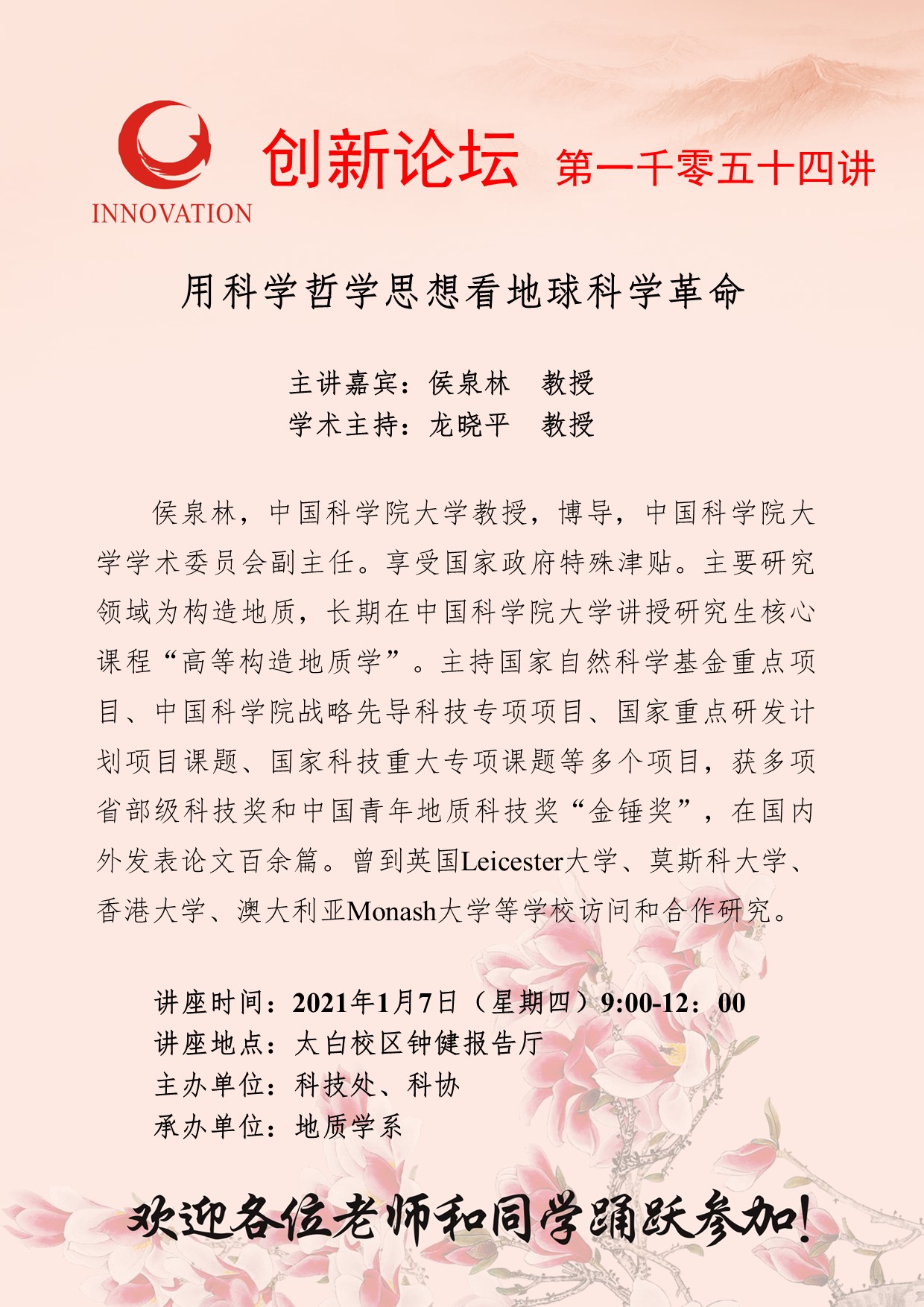 侯泉林 教授 乐投平台创新论坛第一千零五十四讲:用科学哲学思想看地球科学革命 讲座时间 2021年1月7日(星期四) 9:00-12:00 讲座地点 太白校区钟健报告厅 讲座人介绍 侯泉林 教授 讲座内容