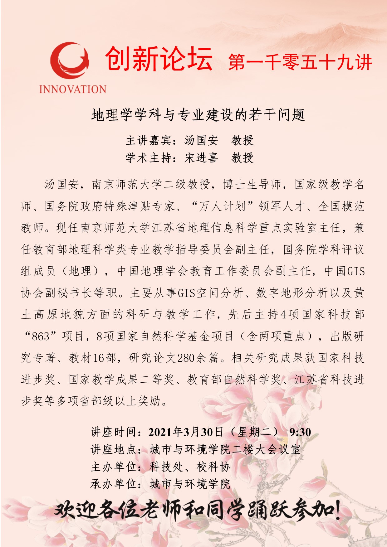 汤国安 教授 乐投平台创新论坛第一千零五十九讲:地理学学科与专业建设的若干问题 讲座时间 2021年3月30日(星期二) 9:30 讲座地点 城市与环境学院二楼大会议室 讲座人介绍 汤国安 教授 讲座内容