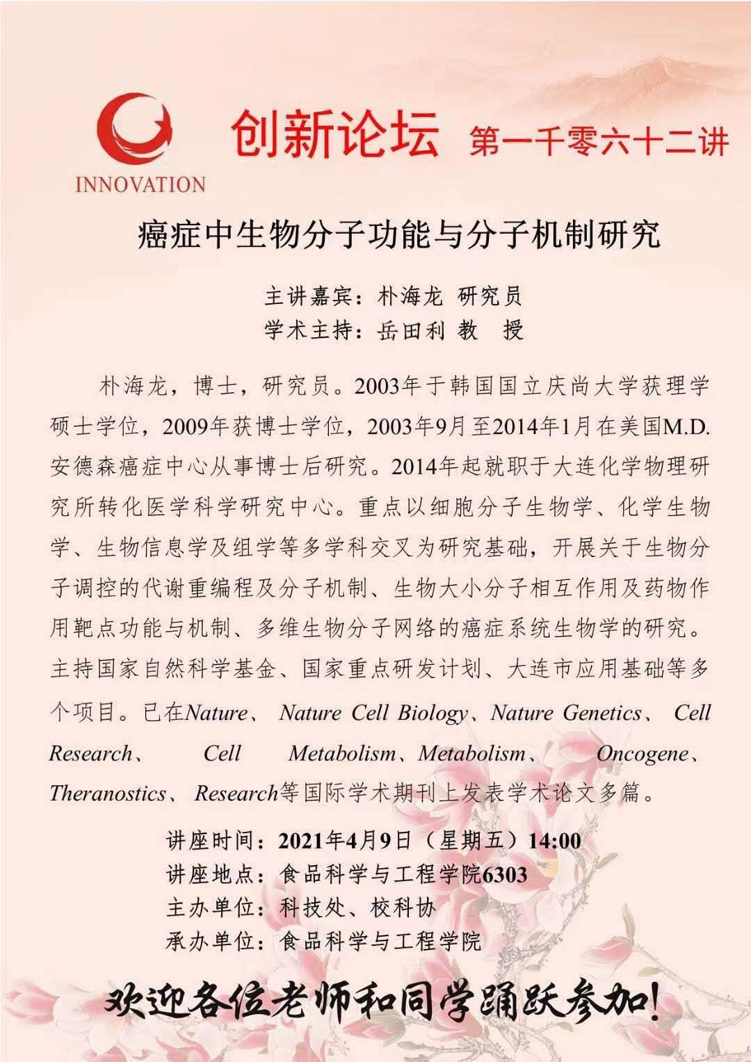 朴海龙 研究员 乐投平台创新论坛第一千零六十二讲:癌症中生物分子功能与分子机制研究 讲座时间 2021年4月9日(星期五)14:00 讲座地点 食品科学与工程学院6303 讲座人介绍 朴海龙 研究员 讲座内容