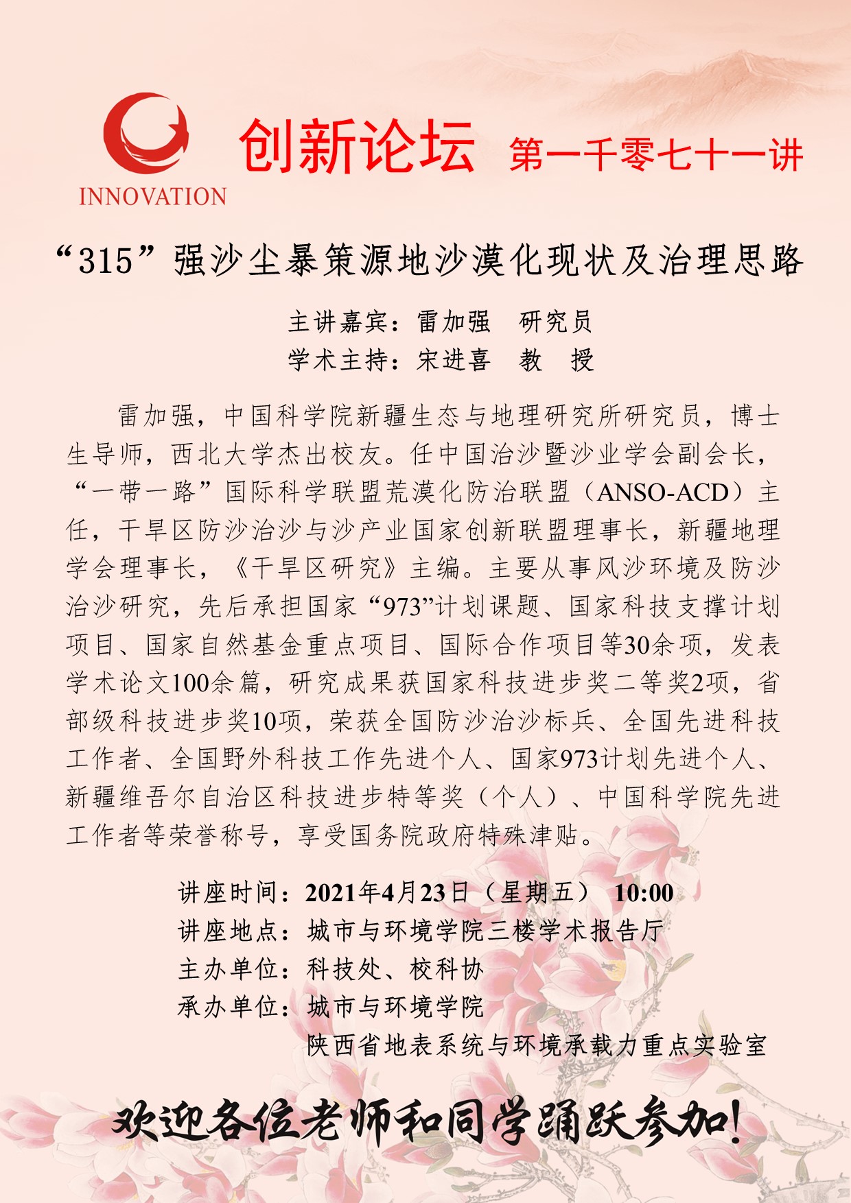 雷加强 研究员 乐投平台创新论坛第一千零七十一讲:“315”强沙尘暴策源地沙漠化现状及治理思路 讲座时间 2021年4月23日(星期五) 10:00 讲座地点 城市与环境学院三楼学术报告厅 讲座人介绍 雷加强 研究员 讲座内容