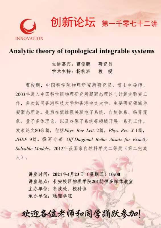 曹俊鹏 研究员 乐投平台创新论坛第一千零七十二讲:Analytic theory of topological integrable systems 讲座时间 2021年4月23日(星期五)10:00 讲座地点 长安校区物理学院201劼恒多媒体教室 讲座人介绍 曹俊鹏 研究员 讲座内容