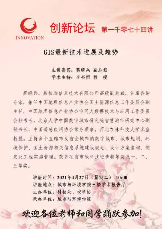 蔡晓兵 副总裁 乐投平台创新论坛第一千零七十四讲:GIS最新技术进展及趋势 讲座时间 2021年4月27日(星期二) 10:00 讲座地点 城市与环境学院三楼学术报告厅 讲座人介绍 蔡晓兵 副总裁 讲座内容