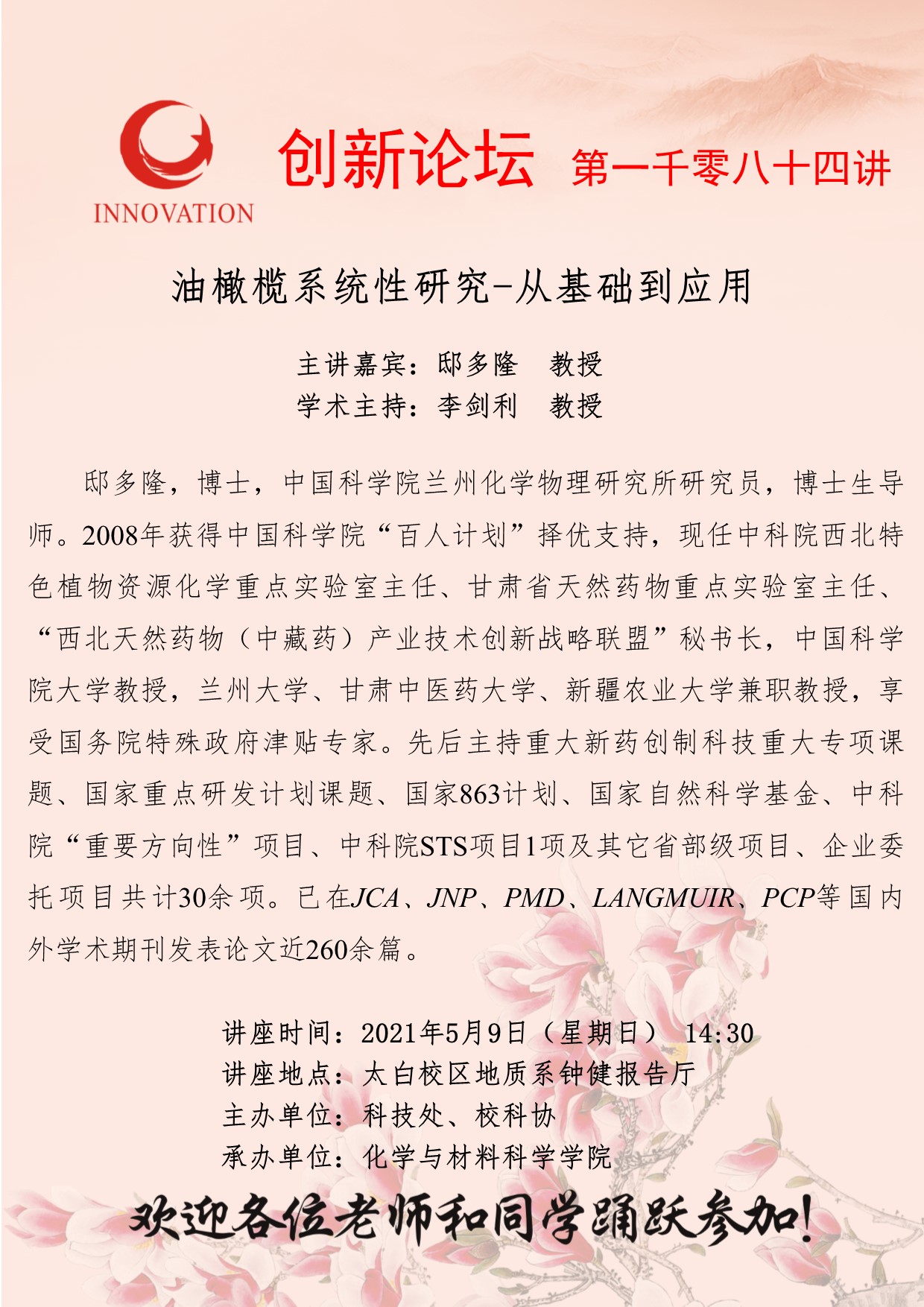 邸多隆 教授 乐投平台创新论坛第一千零八十四讲:油橄榄系统性研究-从基础到应用 讲座时间 2021年5月9日(星期日) 14:30 讲座地点 太白校区地质系钟健报告厅 讲座人介绍 邸多隆 教授 讲座内容