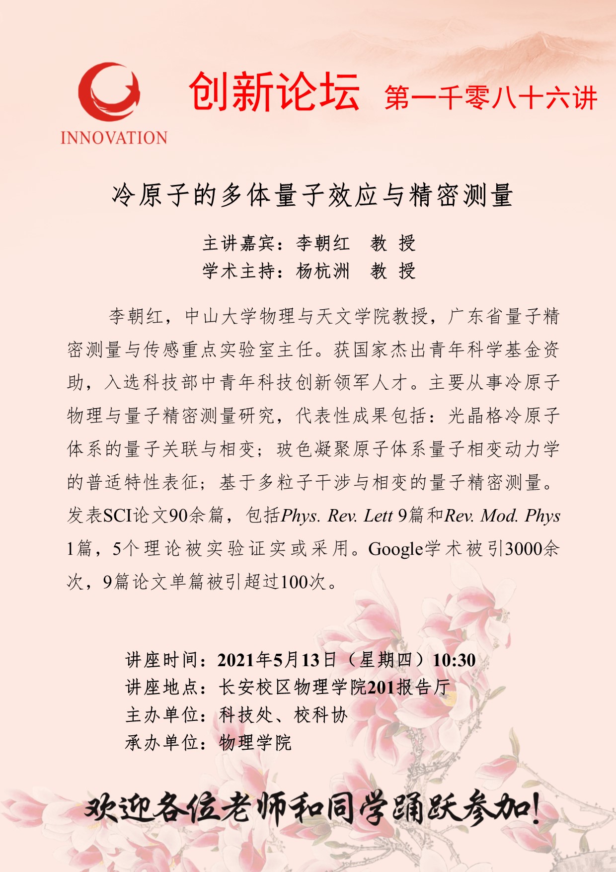 李朝红 教 授 乐投平台创新论坛第一千零八十六讲:冷原子的多体量子效应与精密测量 讲座时间 2021年5月13日(星期四)10:30 讲座地点 长安校区物理学院201报告厅 讲座人介绍 李朝红 教 授 讲座内容