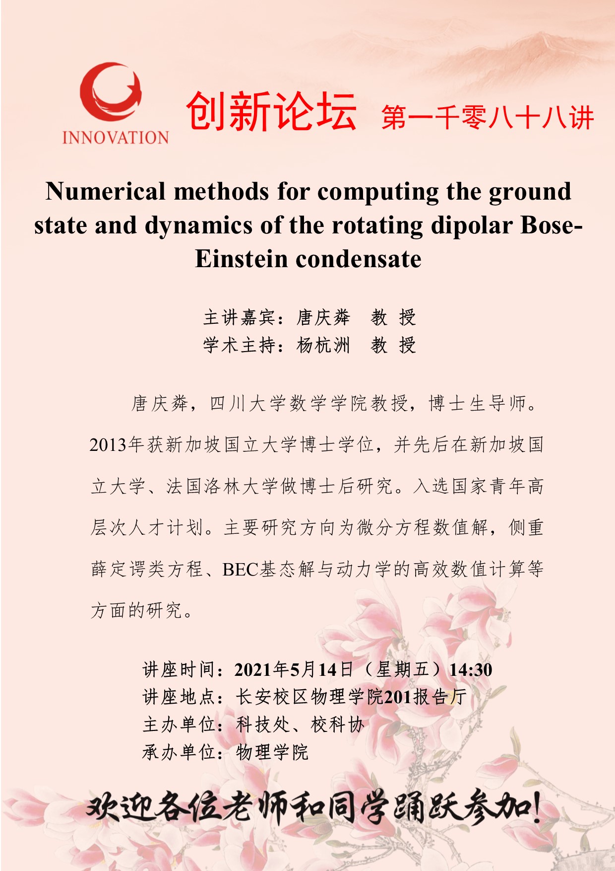 唐庆粦 教 授 乐投平台创新论坛第一千零八十八讲:Numerical methods for computing the ground state and dynamics of the rotating dipolar Bose-Einstein condensate 讲座时间 2021年5月14日(星期五)14:30 讲座地点 长安校区物理学院201报告厅 讲座人介绍 唐庆粦 教 授 讲座内容