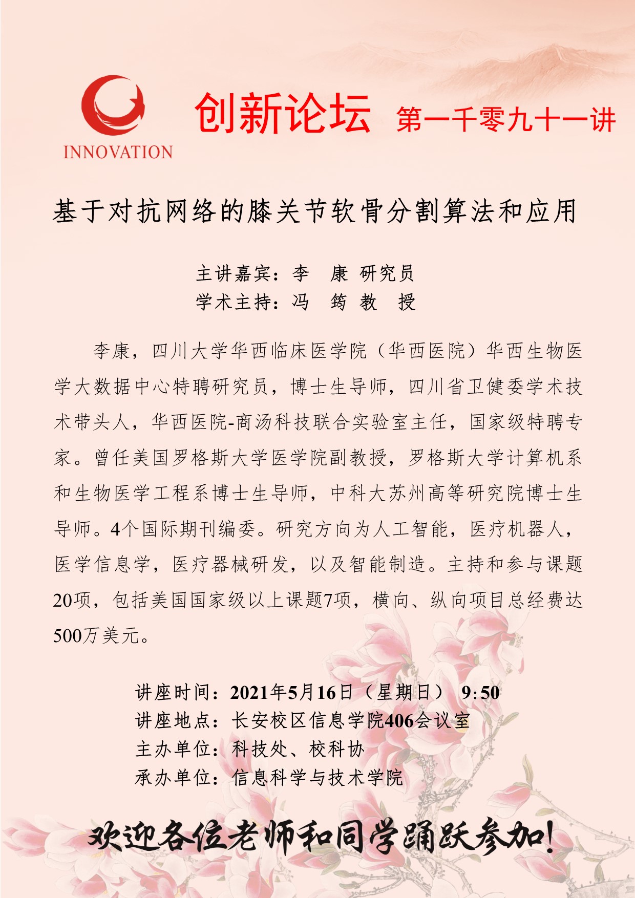 李 康 研究员 乐投平台创新论坛第一千零九十一讲:基于对抗网络的膝关节软骨分割算法和应用 讲座时间 2021年5月16日(星期日) 9:50 讲座地点 长安校区信息学院406会议室 讲座人介绍 李 康 研究员 讲座内容