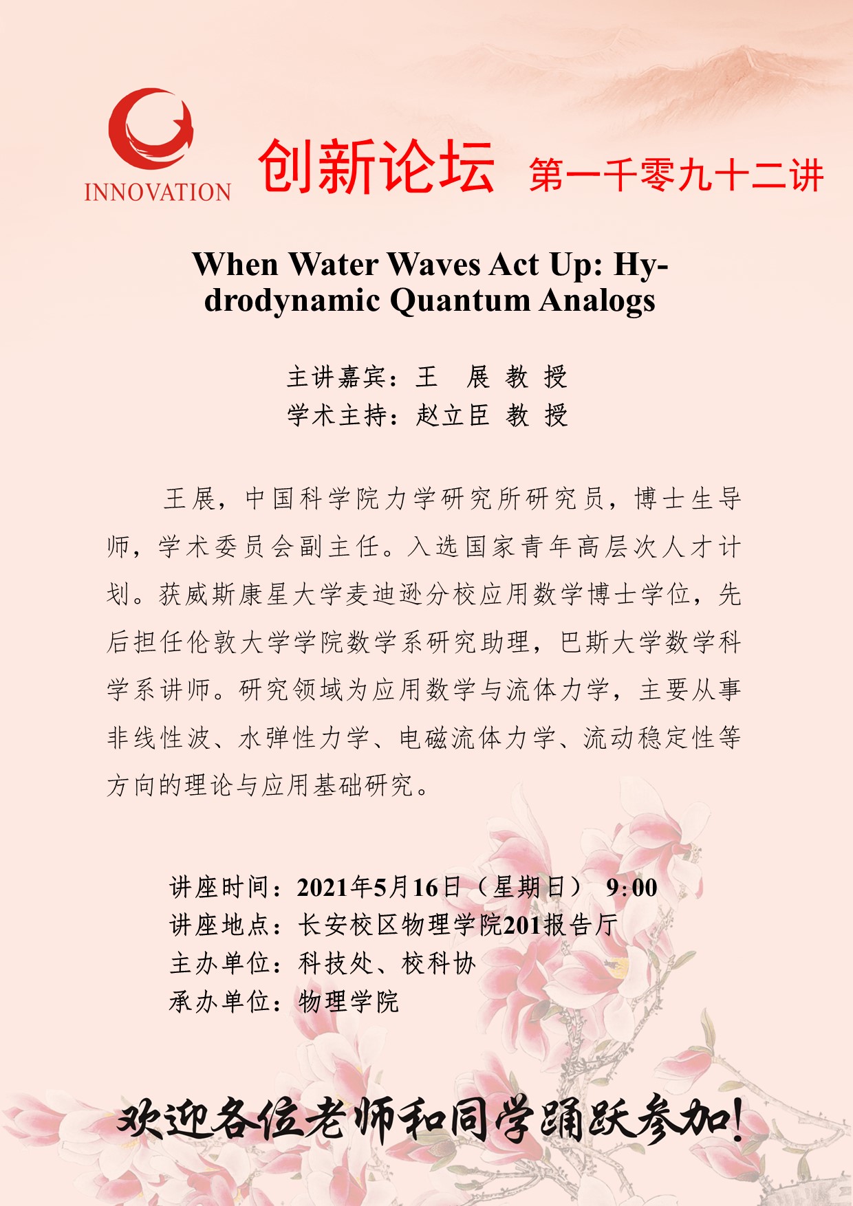 王 展 教 授 乐投平台创新论坛第一千零九十二讲:When Water Waves Act Up: Hydrodynamic Quantum Analogs 讲座时间 2021年5月16日(星期日) 9:00 讲座地点 长安校区物理学院201报告厅 讲座人介绍 王 展 教 授 讲座内容