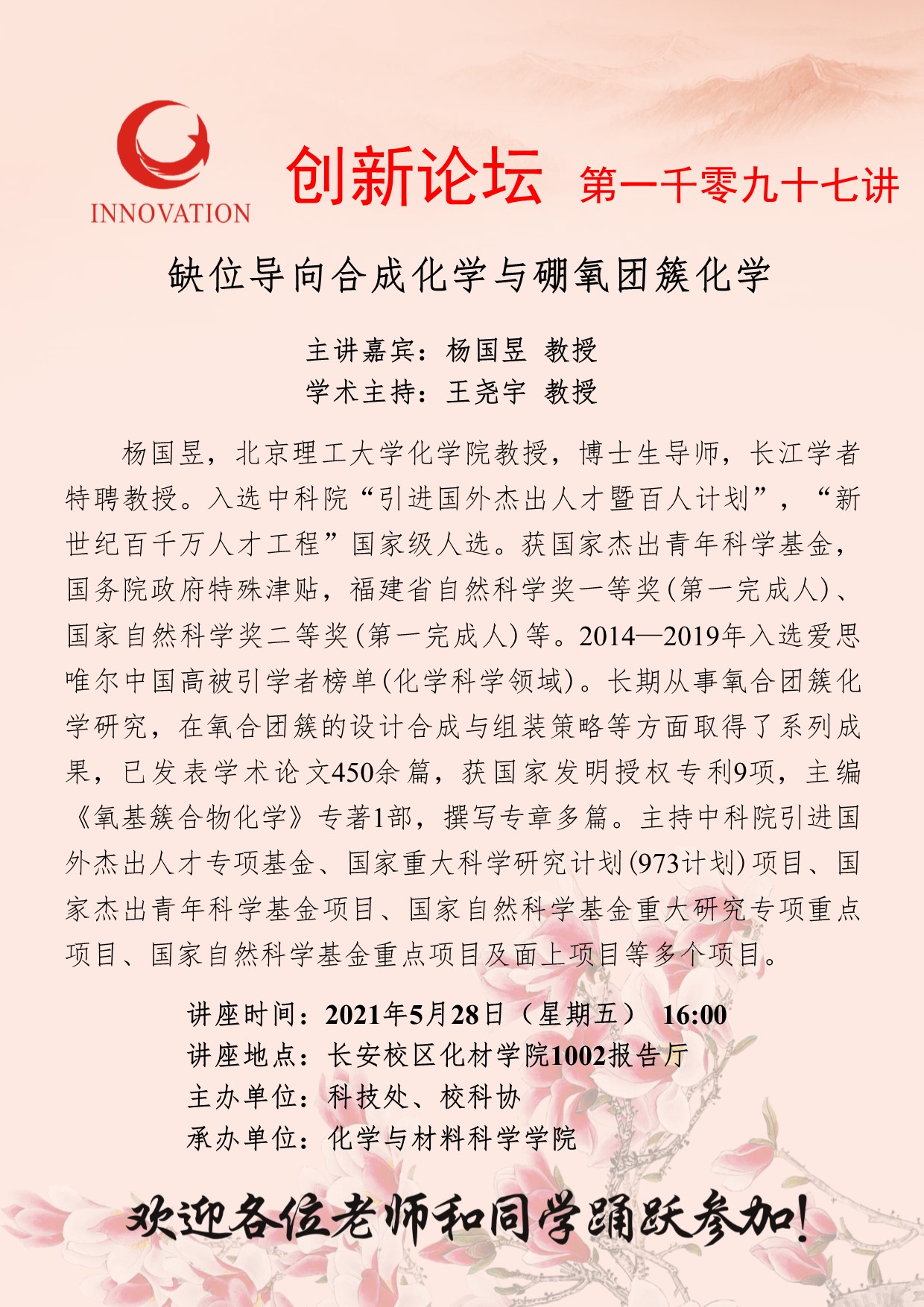 杨国昱 教授 乐投平台创新论坛第一千零九十七讲:缺位导向合成化学与硼氧团簇化学 讲座时间 2021年5月28日(星期五) 16:00 讲座地点 长安校区化材学院1002报告厅 讲座人介绍 杨国昱 教授 讲座内容