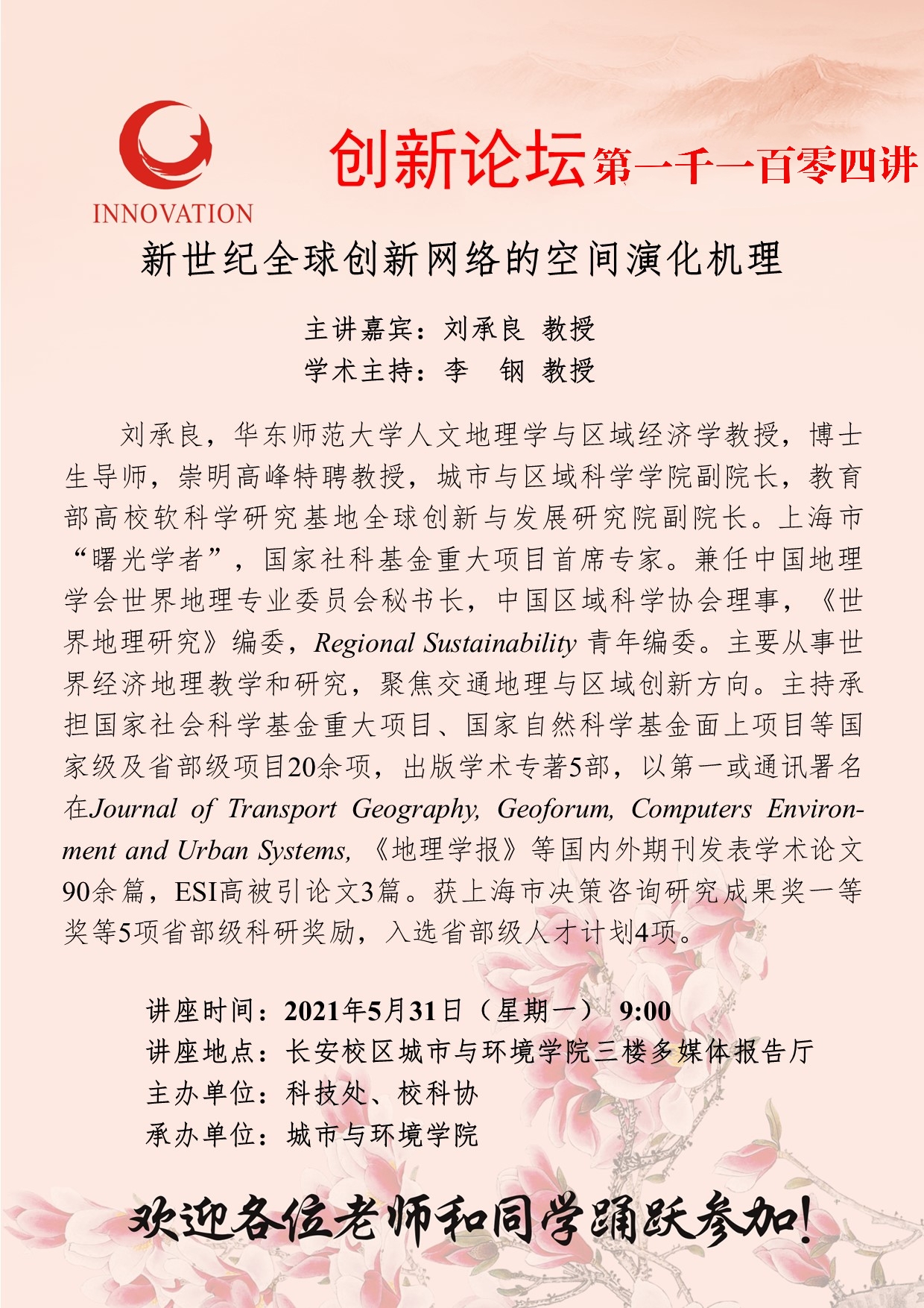刘承良 教授 乐投平台创新论坛第一千一百零四讲:新世纪全球创新网络的空间演化机理 讲座时间 2021年5月31日(星期一) 9:00 讲座地点 长安校区城市与环境学院三楼多媒体报告厅 讲座人介绍 刘承良 教授 讲座内容