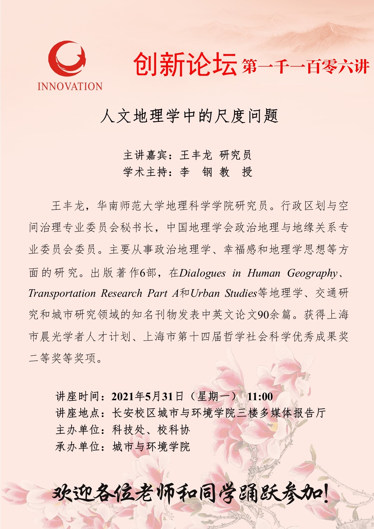 王丰龙 研究员 乐投平台创新论坛第一千一百零六讲:人文地理学中的尺度问题 讲座时间 2021年5月31日(星期一) 11:00 讲座地点 长安校区城市与环境学院三楼多媒体报告厅 讲座人介绍 王丰龙 研究员 讲座内容