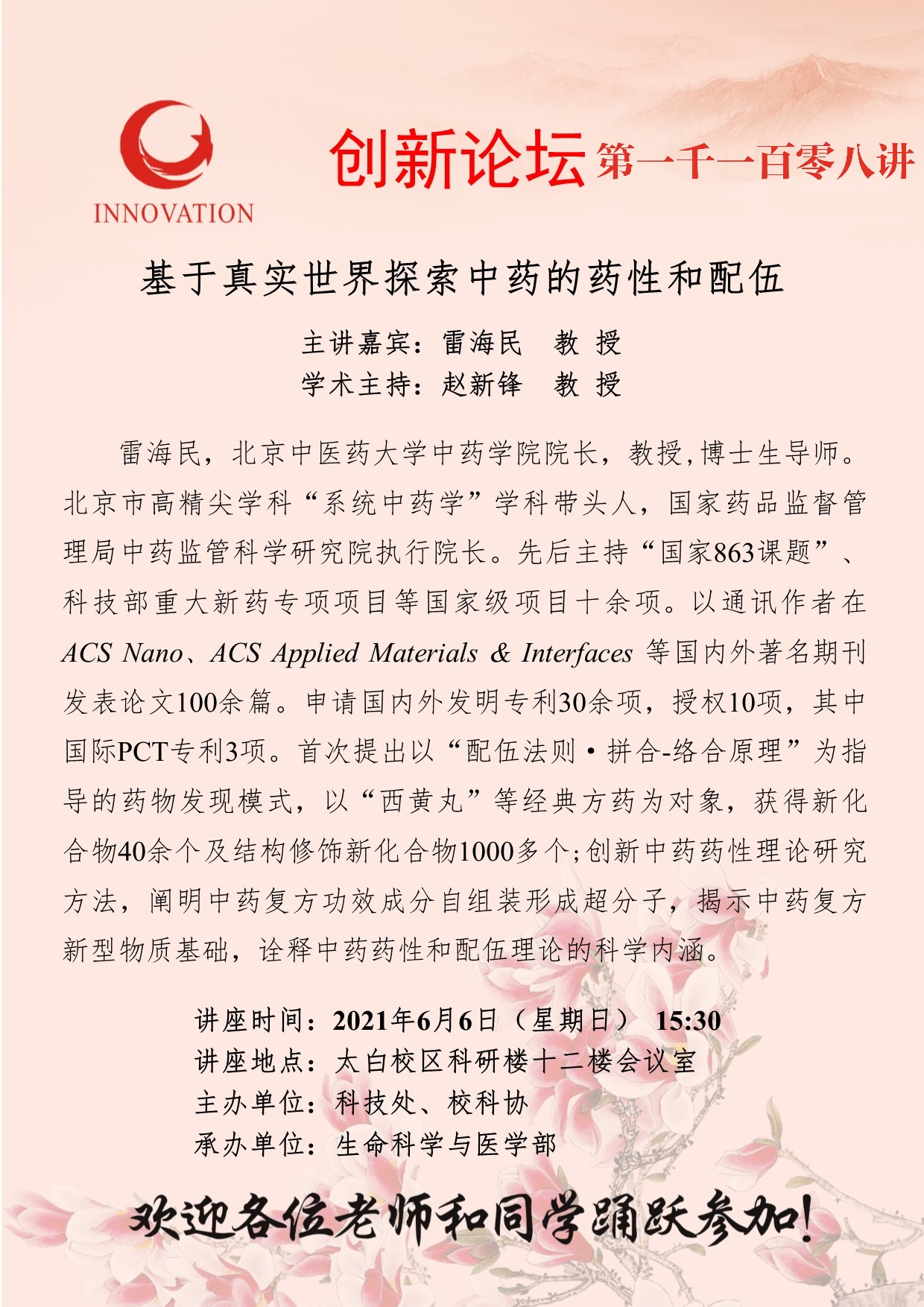雷海民 教 授 乐投平台创新论坛第一千一百零八讲:基于真实世界探索中药的药性和配伍 讲座时间 2021年6月6日(星期日) 15:30 讲座地点 太白校区科研楼十二楼会议室 讲座人介绍 雷海民 教 授 讲座内容