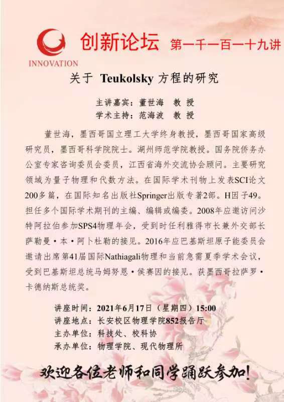 董世海 教 授 乐投平台创新论坛第一千一百一十九讲:关于 Teukolsky 方程的研究 讲座时间 2021年6月17日(星期四)15:00 讲座地点 长安校区物理学院852报告厅 讲座人介绍 董世海 教 授 讲座内容