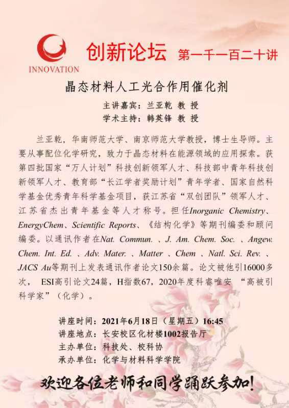 兰亚乾 教 授 乐投平台创新论坛第一千一百二十讲:晶态材料人工光合作用催化剂 讲座时间 2021年6月18日(星期五)16:45 讲座地点 长安校区化材楼1002报告厅 讲座人介绍 兰亚乾 教 授 讲座内容