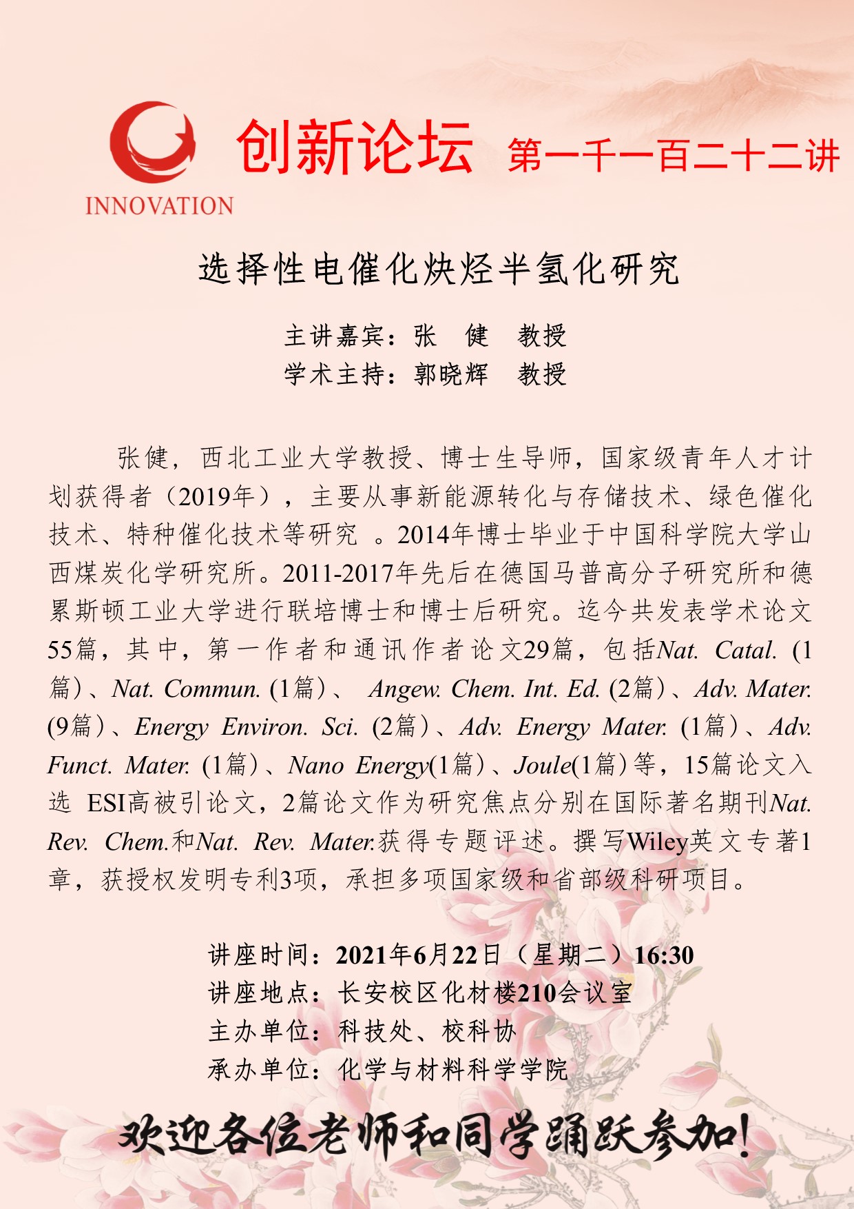 张 健 教授 乐投平台创新论坛第一千一百二十二讲:选择性电催化炔烃半氢化研究 讲座时间 2021年6月22日(星期二)16:30 讲座地点 长安校区化材楼210会议室 讲座人介绍 张 健 教授 讲座内容