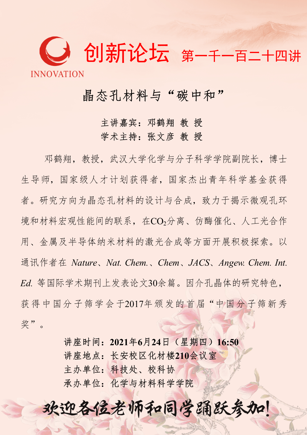 邓鹤翔 教 授 乐投平台创新论坛第一千一百二十四讲:晶态孔材料与“碳中和” 讲座时间 2021年6月24日(星期四)16:50 讲座地点 长安校区化材楼210会议室 讲座人介绍 邓鹤翔 教 授 讲座内容