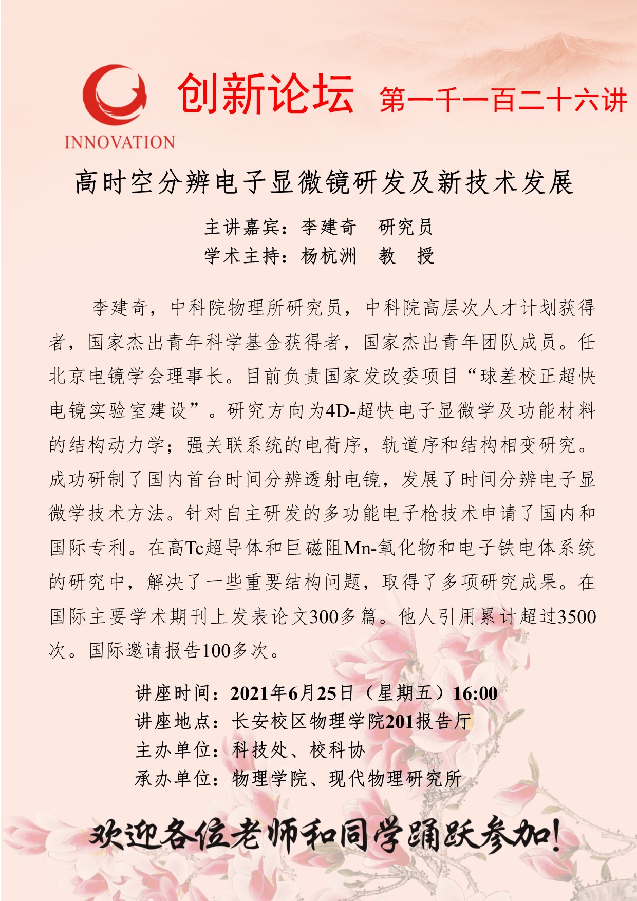 李建奇 研究员 乐投平台创新论坛第一千一百二十六讲:高时空分辨电子显微镜研发及新技术发展 讲座时间 2021年6月25日(星期五)16:00 讲座地点 长安校区物理学院201报告厅 讲座人介绍 李建奇 研究员 讲座内容