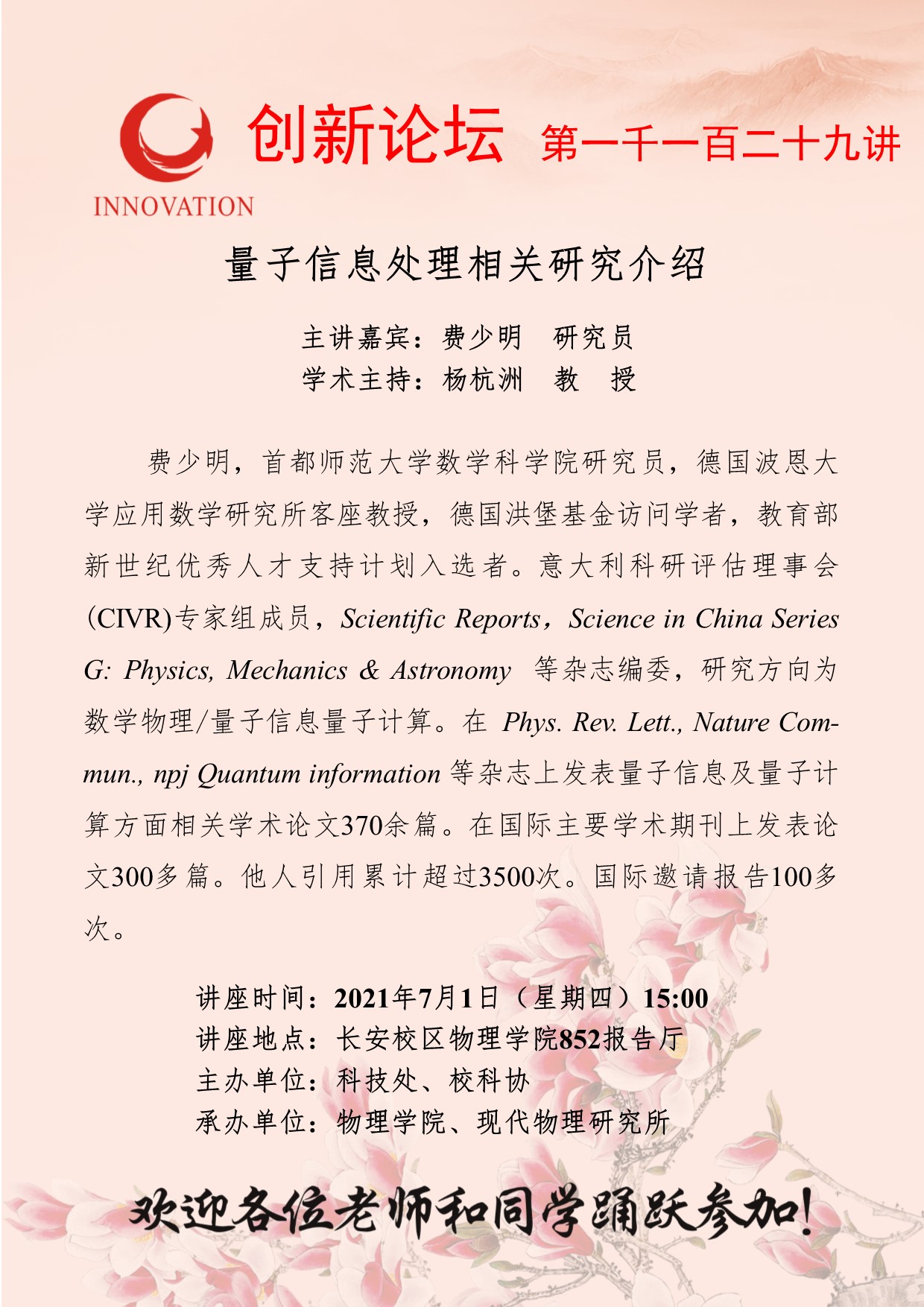 费少明 研究员 乐投平台创新论坛第一千一百二十九讲:量子信息处理相关研究介绍 讲座时间 2021年7月1日(星期四)15:00 讲座地点 长安校区物理学院852报告厅 讲座人介绍 费少明 研究员 讲座内容