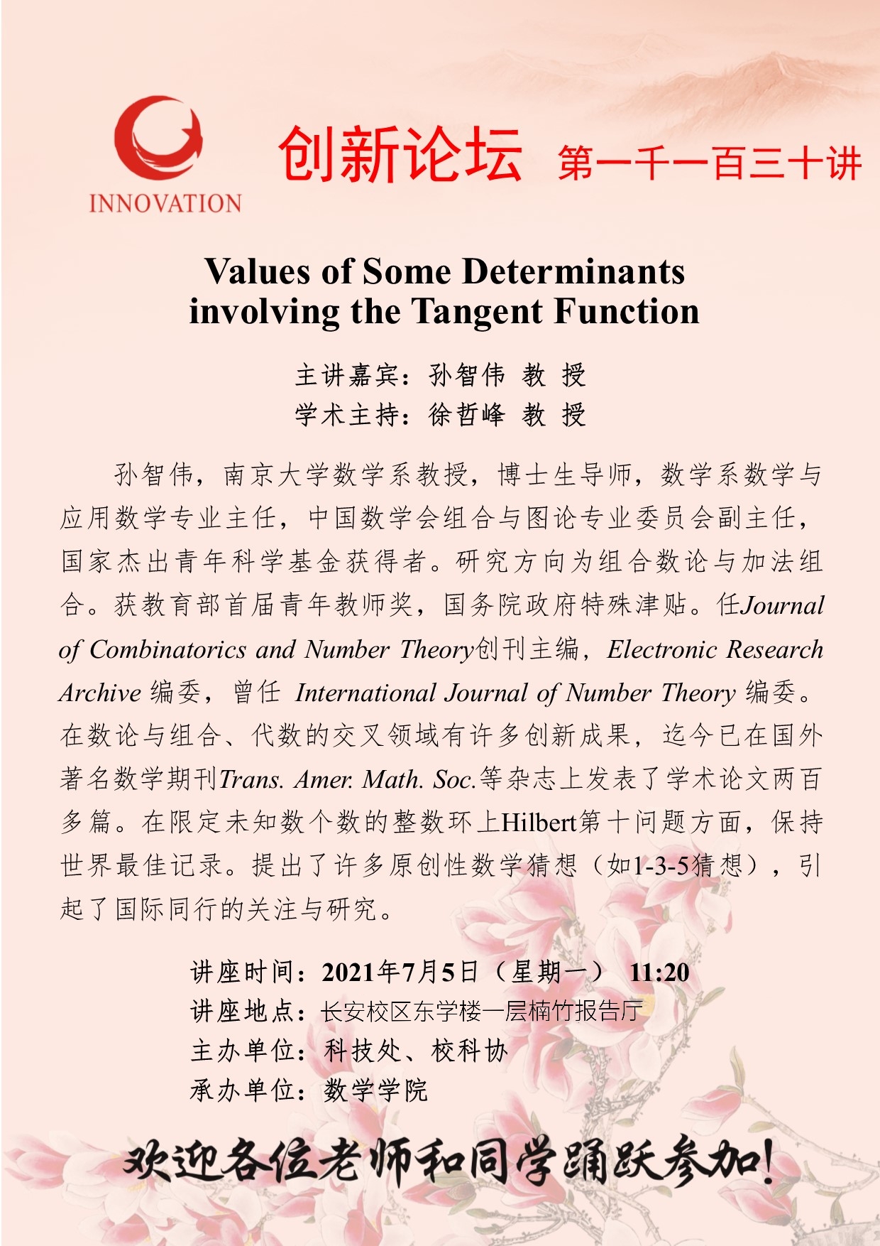 孙智伟 教 授 乐投平台创新论坛第一千一百三十讲:Values of Some Determinants involving the Tangent Function 讲座时间 2021年7月5日(星期一) 11:20 讲座地点 长安校区东学楼一层楠竹报告厅 讲座人介绍 孙智伟 教 授 讲座内容