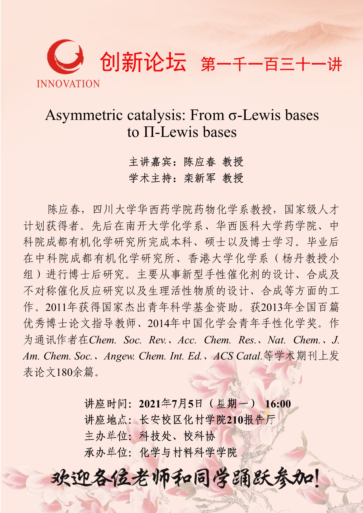 陈应春 教授 乐投平台创新论坛第一千一百三十一讲:Asymmetric catalysis: From σ-Lewis bases to Π-Lewis bases 讲座时间 2021年7月5日(星期一)16:00 讲座地点 长安校区化材学院210报告厅 讲座人介绍 陈应春 教授 讲座内容