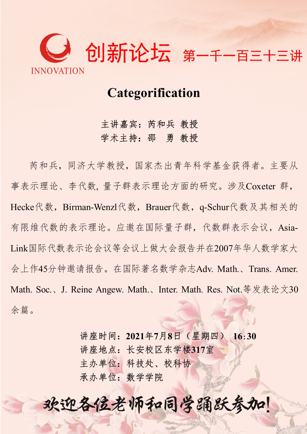 芮和兵 教授 乐投平台创新论坛第一千一百三十三讲:Categorification 讲座时间 2021年7月8日(星期四)16:30 讲座地点 长安校区东学楼317室 讲座人介绍 芮和兵 教授 讲座内容
