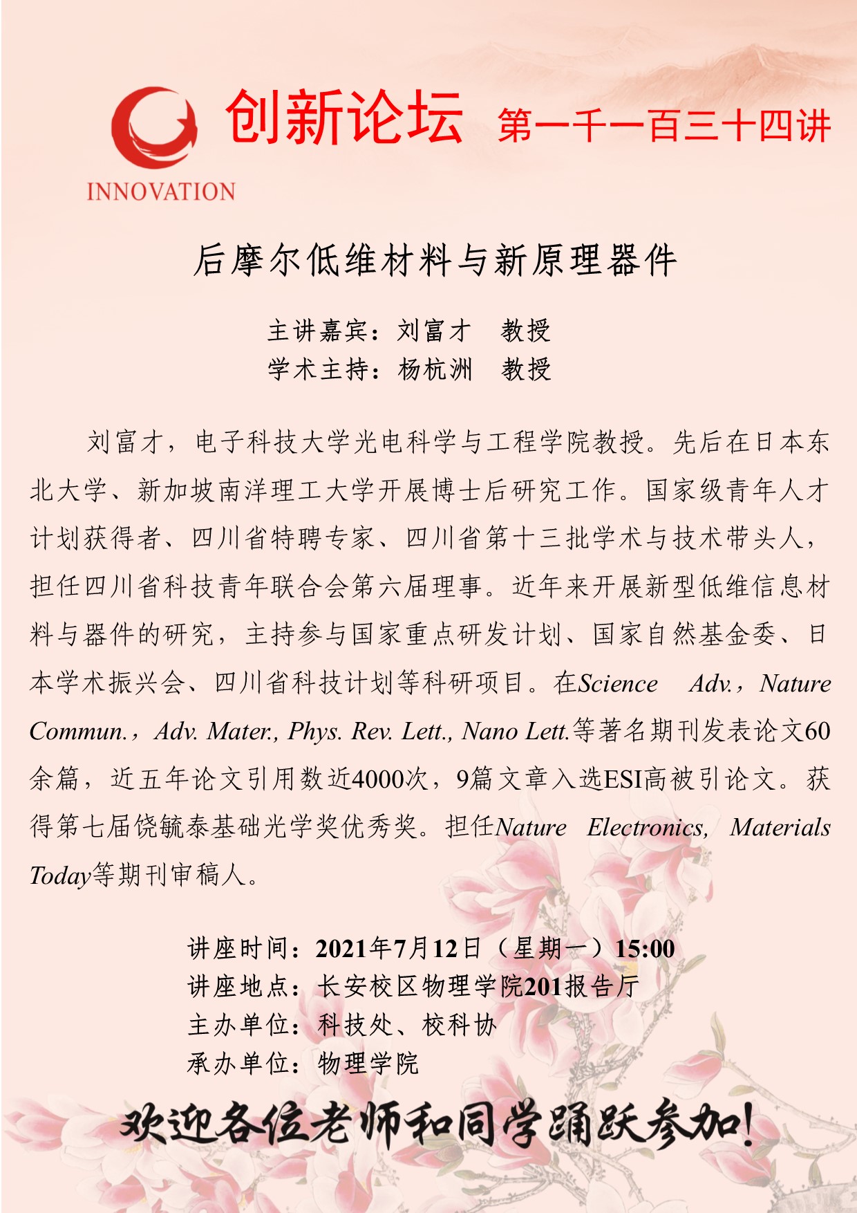 刘富才 教授 乐投平台创新论坛第一千一百三十四讲:后摩尔低维材料与新原理器件 讲座时间 2021年7月12日(星期一)15:00 讲座地点 长安校区物理学院201报告厅 讲座人介绍 刘富才 教授 讲座内容