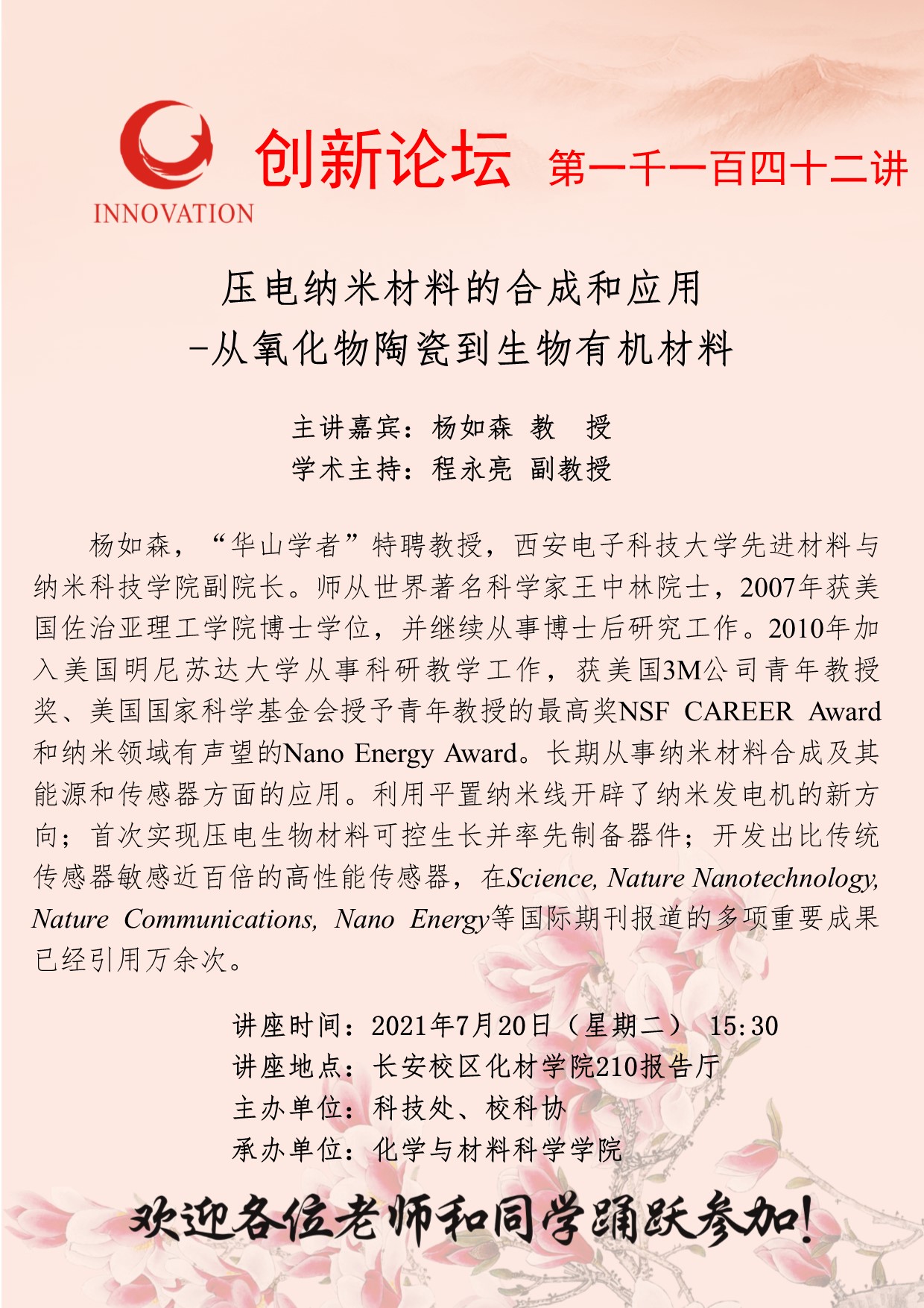 杨如森 教授 乐投平台创新论坛第一千一百四十二讲:压电纳米材料的合成和应用-从氧化物陶瓷到生物有机材料 讲座时间 2021年7月20日(星期二) 15:30 讲座地点 长安校区化材学院210报告厅 讲座人介绍 杨如森 教授 讲座内容