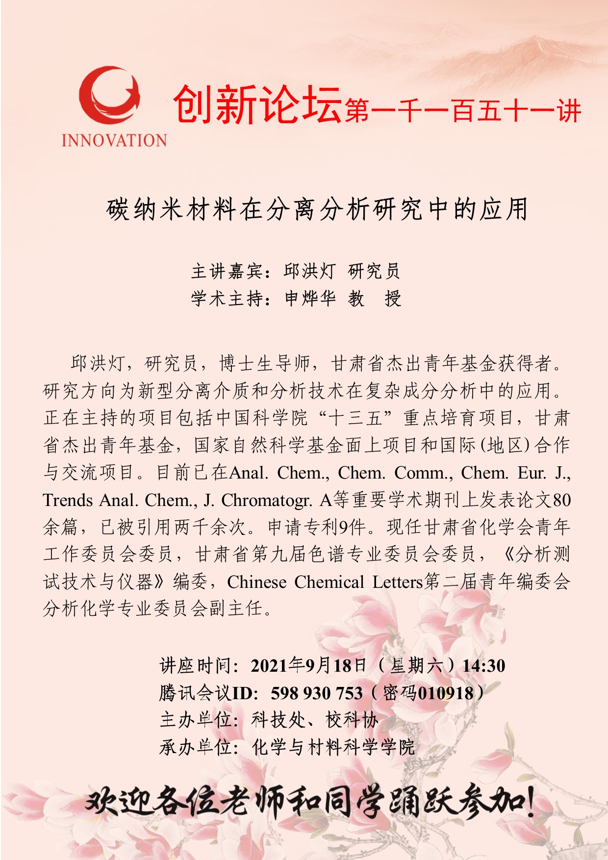 邱洪灯 研究员 乐投平台创新论坛第一千一百五十一讲:碳纳米材料在分离分析研究中的应用 讲座时间 2021年9月18日(星期六)14:30 讲座地点 腾讯会议ID:598 930 753 讲座人介绍 邱洪灯 研究员 讲座内容