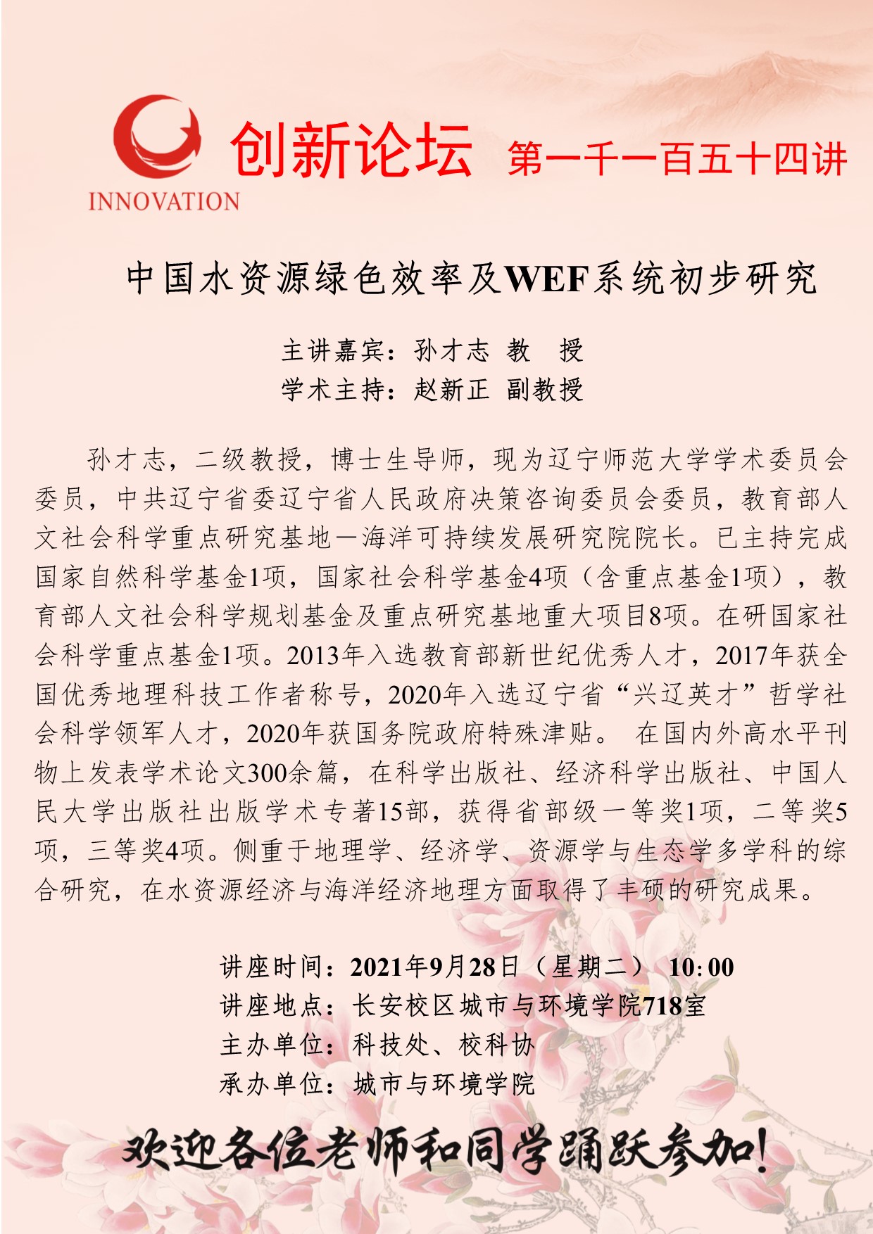孙才志 教授 乐投平台创新论坛第一千一百五十四讲:中国水资源绿色效率及WEF系统初步研究 讲座时间 2021年9月28日(星期二) 10:00 讲座地点 长安校区城市与环境学院718室 讲座人介绍 孙才志 教授 讲座内容