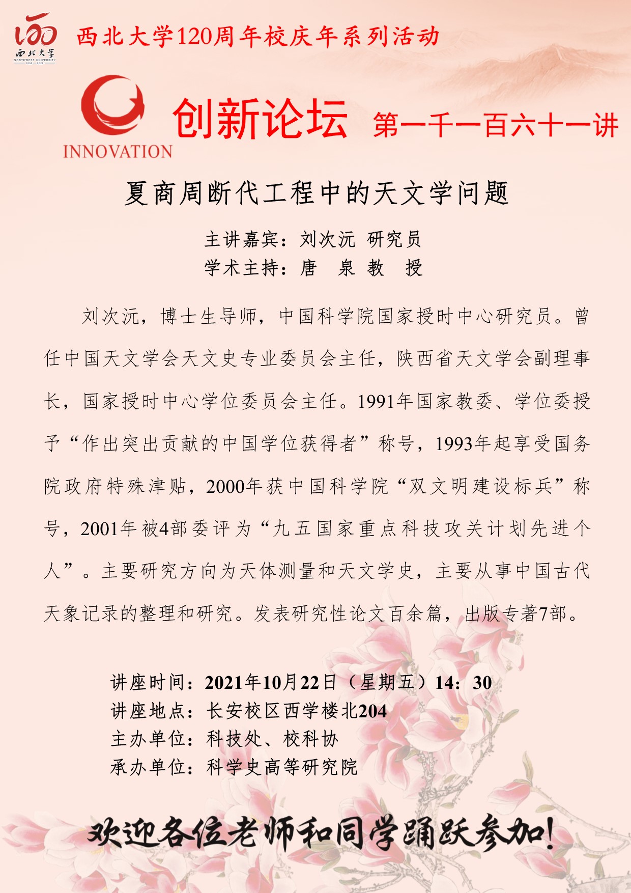 刘次沅 研究员 乐投平台创新论坛第一千一百六十一讲暨120周年校庆年系列活动:夏商周断代工程中的天文学问题 讲座时间 2021年10月22日(星期五)14:30 讲座地点 长安校区西学楼北204 讲座人介绍 刘次沅 研究员 讲座内容
