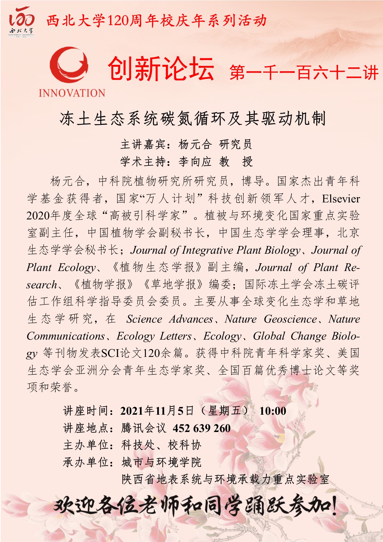 杨元合 研究员 乐投平台创新论坛第一千一百六十二讲暨120周年校庆年系列活动:冻土生态系统碳氮循环及其驱动机制 讲座时间 2021年11月5日(星期五)10:00 讲座地点 腾讯会议 452 639 260 讲座人介绍 杨元合 研究员 讲座内容