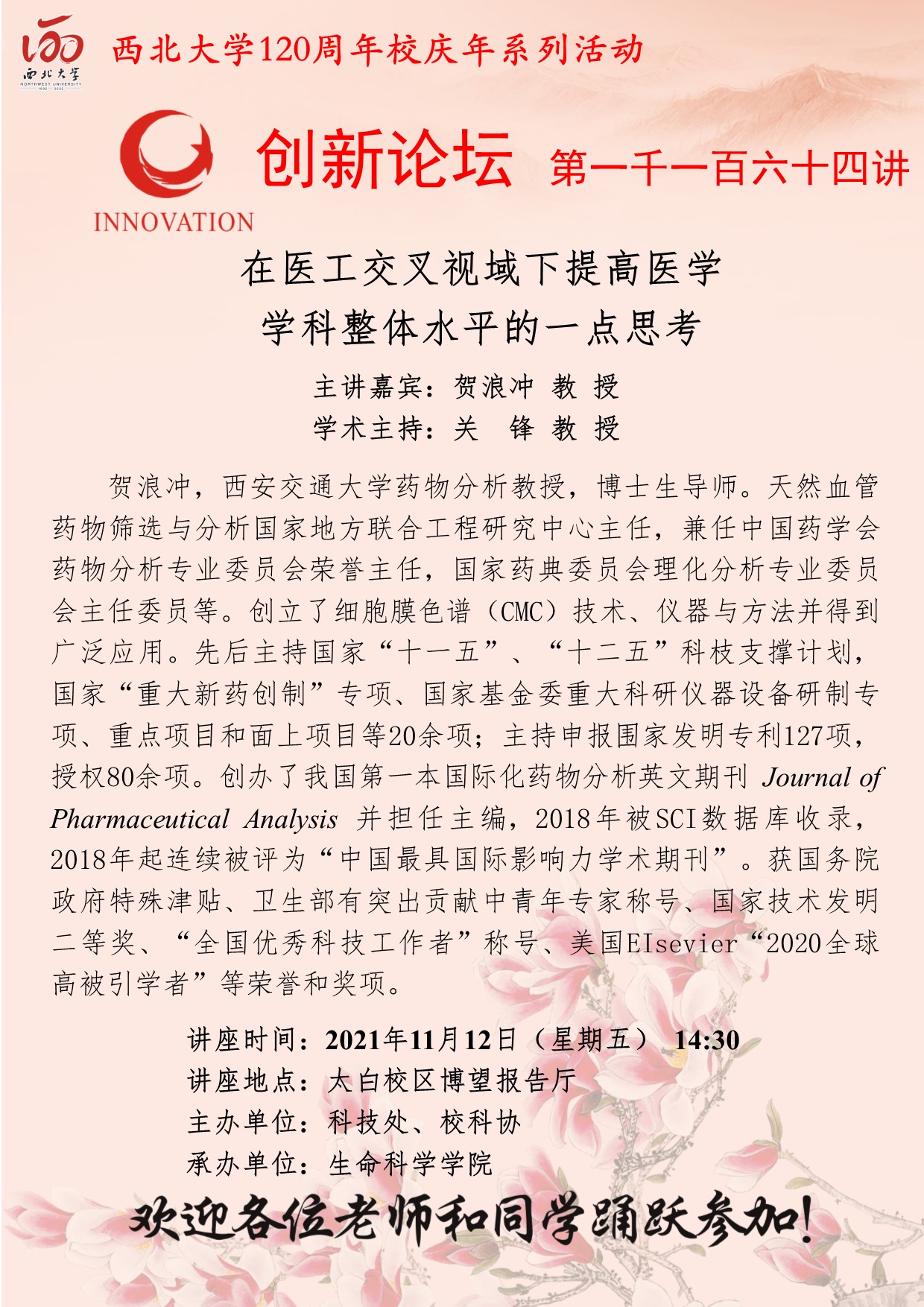贺浪冲 教授 乐投平台创新论坛第一千一百六十四讲暨120周年校庆年系列活动:在医工交叉视域下提高医学学科整体水平的一点思考 讲座时间 2021年11月12日(星期五) 14:30 讲座地点 太白校区博望报告厅 讲座人介绍 贺浪冲 教授 讲座内容
