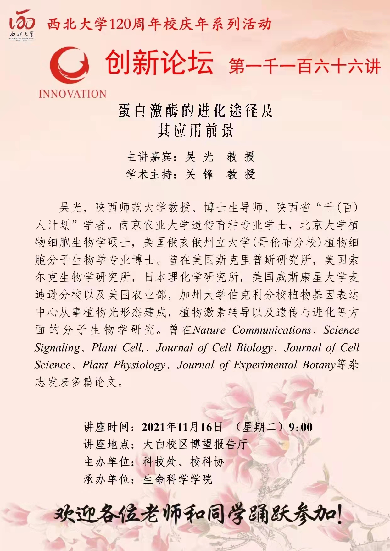 吴光 教授 乐投平台创新论坛第一千一百六十六讲暨120周年校庆年系列活动:蛋白激酶的进化途径及其应用前景 讲座时间 2021年11月16日 (星期二)9:00 讲座地点 太白校区博望报告厅 讲座人介绍 吴光 教授 讲座内容